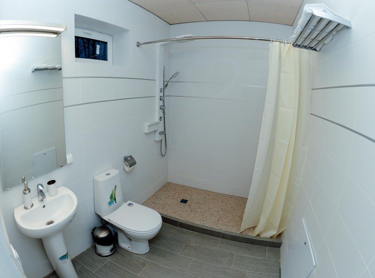 Ванная комната в двухместном домике: душ, унитаз, раковина, зеркало, холодная и горячая вода, косметика, полотенца, фен.