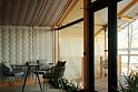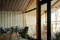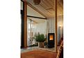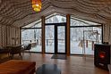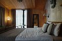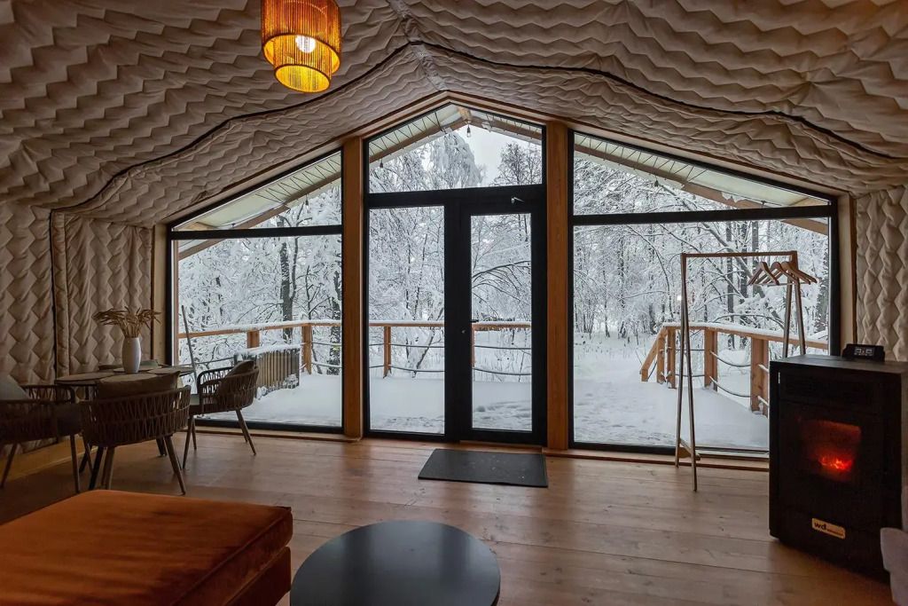 Интерьер лоджа выполнен из натурального дерева. Большие панорамные окна, стирающие грань между домом и лесом. Кровать в уютной нише и диван у огня — всё продумано для жизни в гармонии с собой.