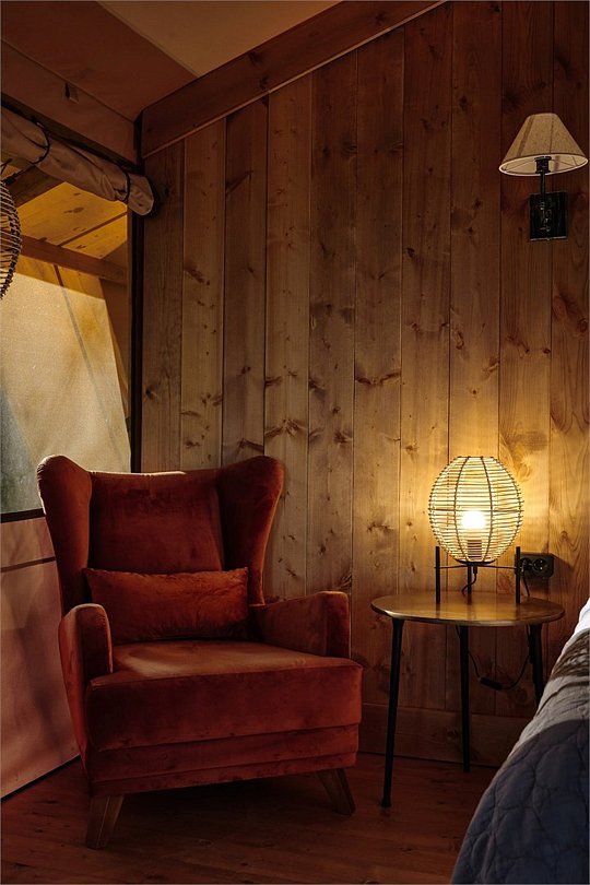 Лодж в сафари-стиле с роскошным видом на озеро, панорамными окнами, уединенной террасой. В просторной комнате большая двуспальная кровать, в зоне отдыха удобный раскладной диван, печь-камин, создающая уютную атмосферу. Современная просторная ванная комната. В качестве дополнительной услуги организуем дизайн ванной комнаты в романтическом стиле, чтобы сделать ваше пребывание ещё более волшебным. В стоимость проживания включены завтрак, премиальные постельные принадлежности, экологичная косметика, вода, чай.