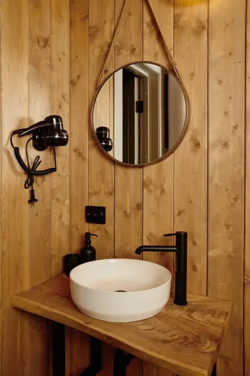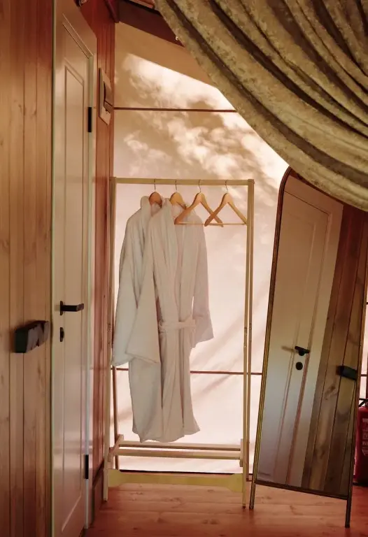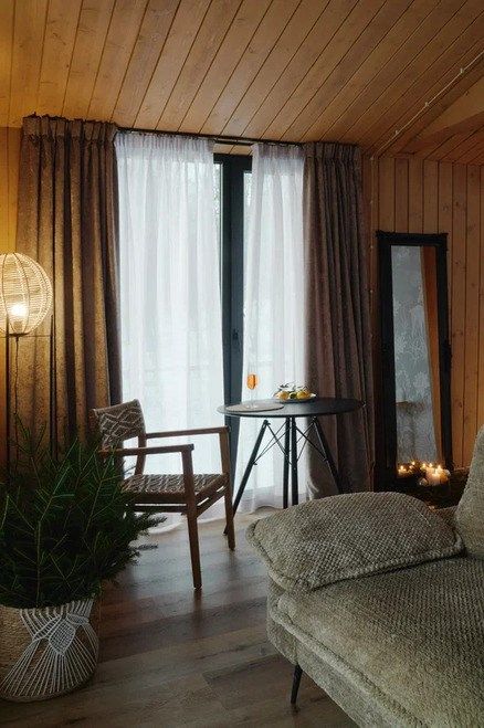 Затерянный в гуще леса, вдали от туристических троп и соседних построек, этот уютный лодж площадью 36 м² — идеальный побег для тех, кто ищет диалог с природой. Здесь — только деревья, шепот ветра в кронах и пение птиц, нарушающее благородную тишину. Ваш личный уголок дикой природы. Просыпайтесь под мягкий свет, пробивающийся сквозь хвойные ветви, вдыхайте смолистый аромат леса и слушайте пение птиц. Интерьер лоджа выполнен из натурального дерева. Большие панорамные окна, стирающие грань между домом и лесом. Кровать в уютной нише и диван у огня — всё продумано для жизни в гармонии с собой.
