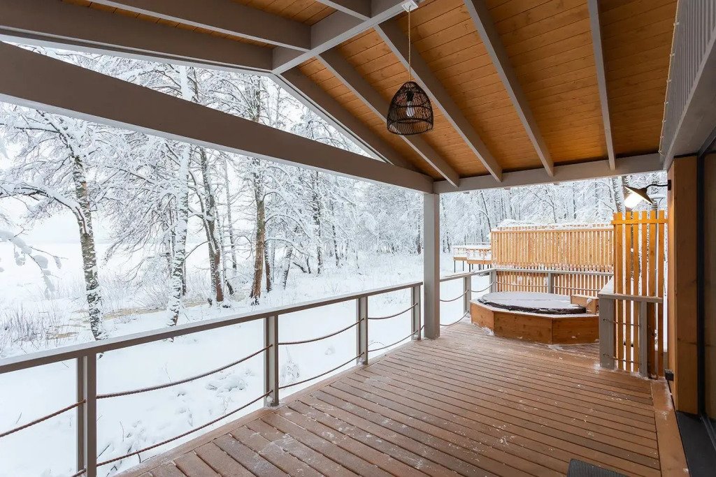 Насладитесь завтраком на просторной террасе с видом на озеро, а вечером согрейтесь у потрескивающей печки. На террасе расположена купель.