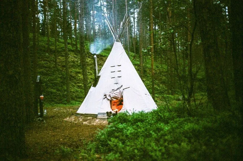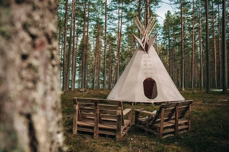 Жилище освещается свечными фонариками и керосиновой лампой. Рядом с типи находится место для костра, скамейки и стол.
