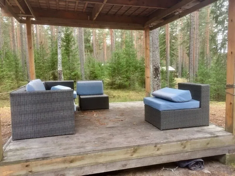 Рядом с палатками - место для костра, деревянные кресла и столик на террасе.