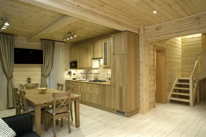 Кухня оснащена всей необходимой современной техникой, чтобы гости меньше заботились о быте и посвящали себя досугу на природе.