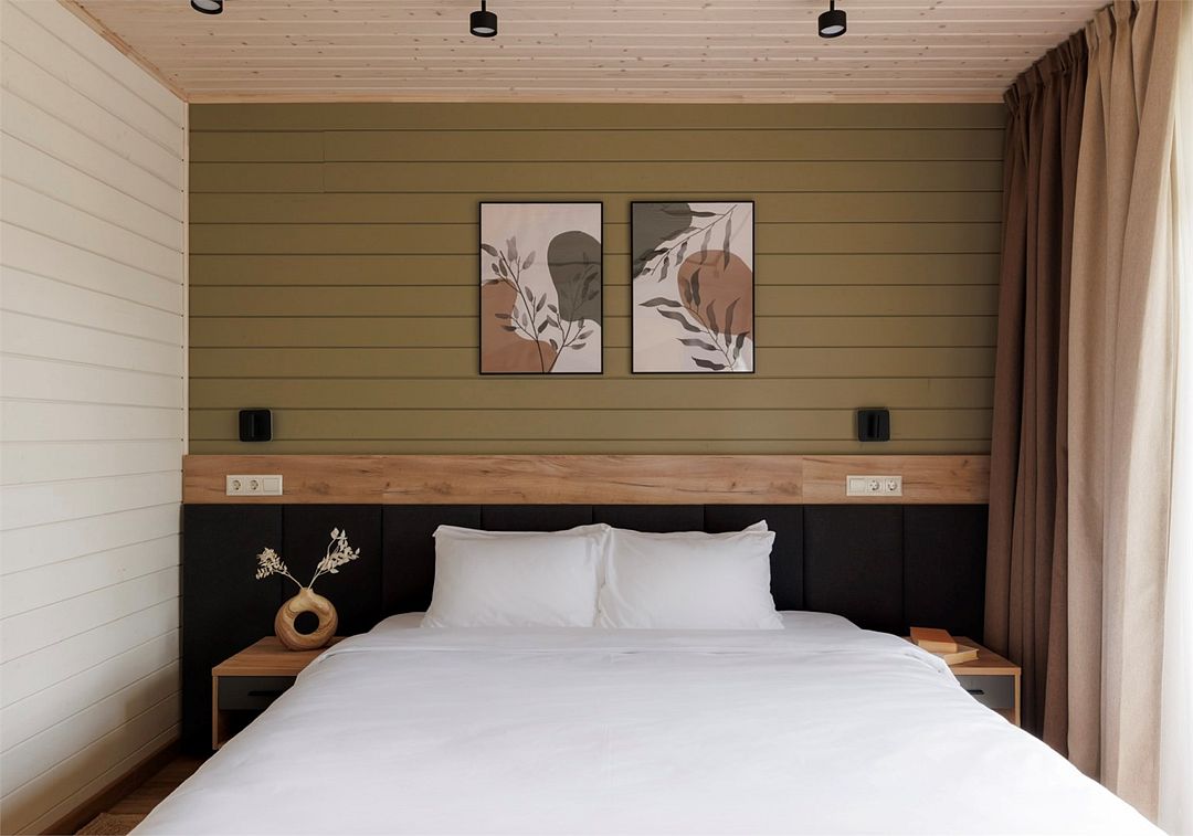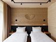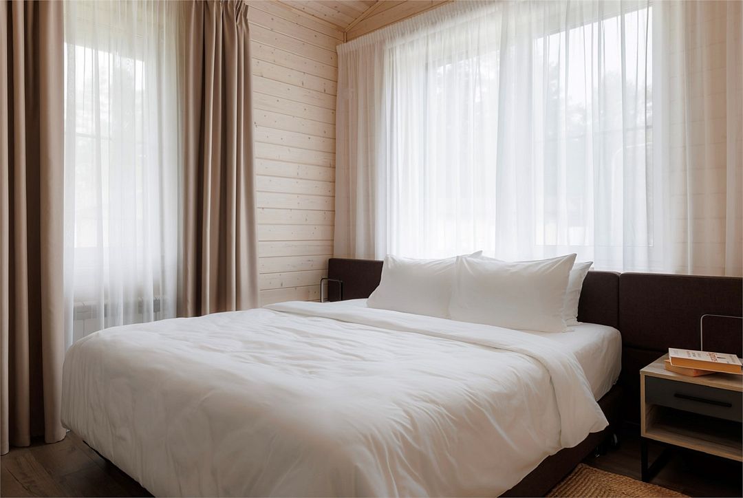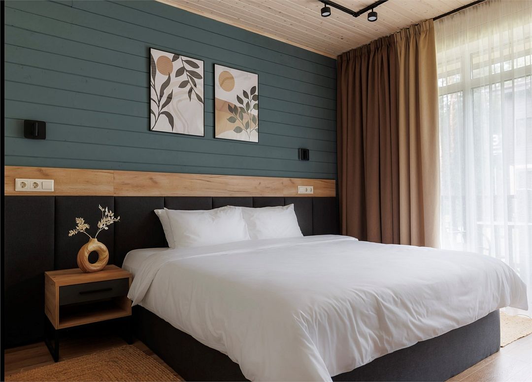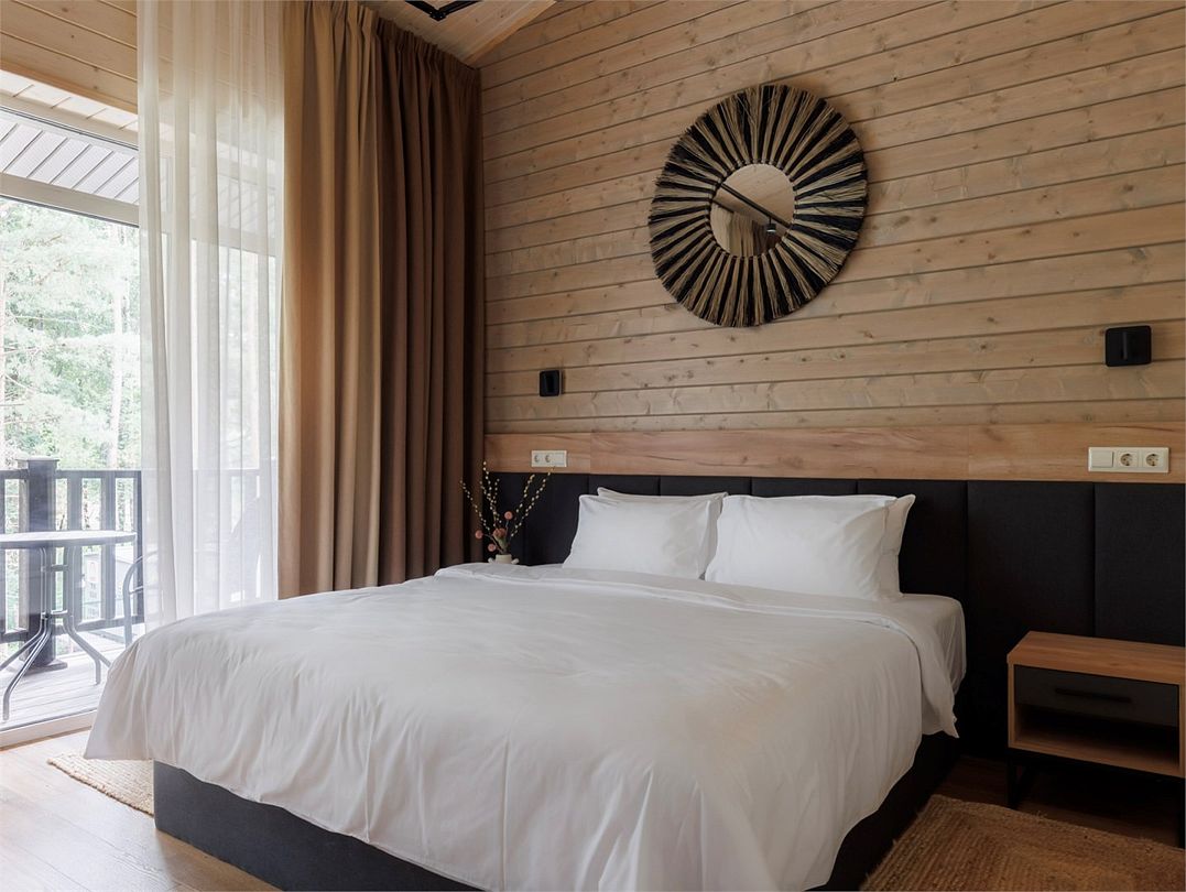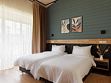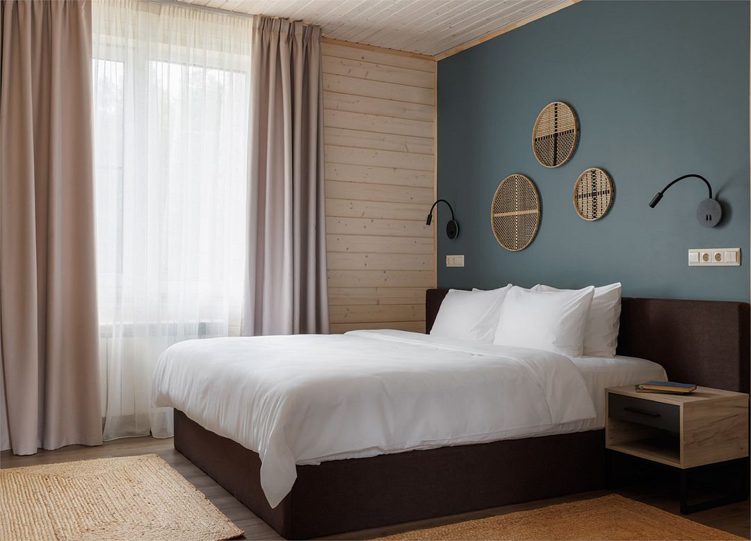 Комфортабельный номер с одной большой двуспальной кроватью. Интерьер номера выполнен в элегантном скандинавском стиле, создавая атмосферу уюта и спокойствия.