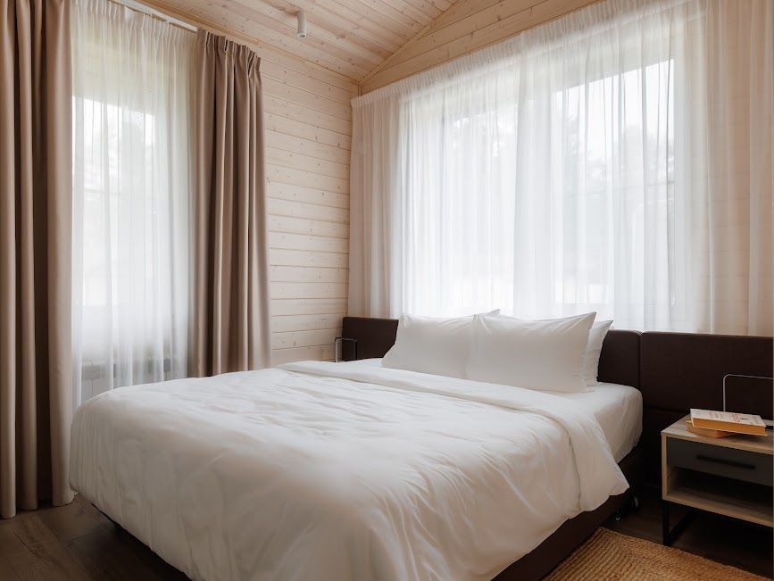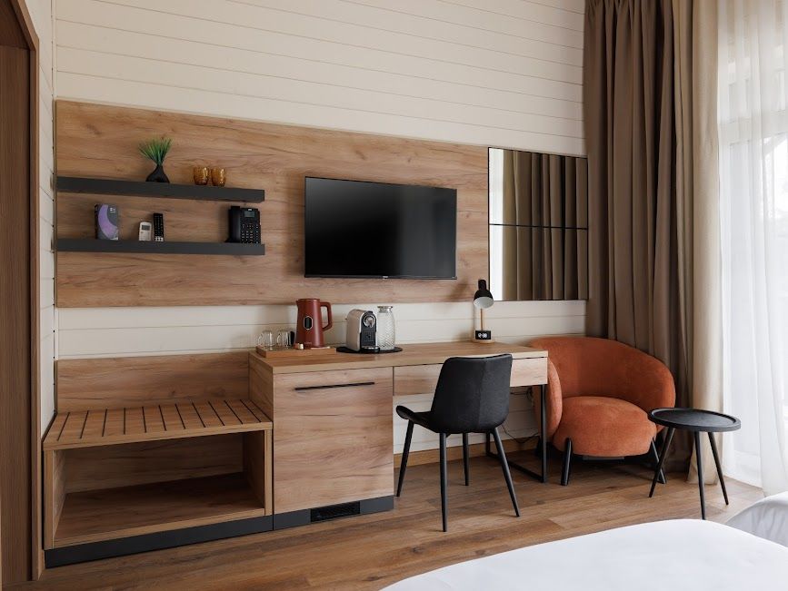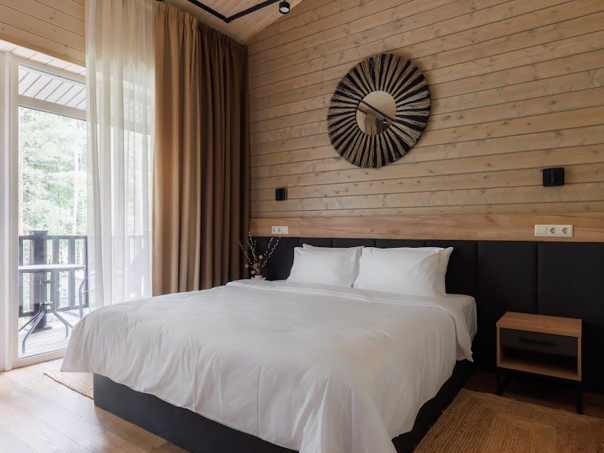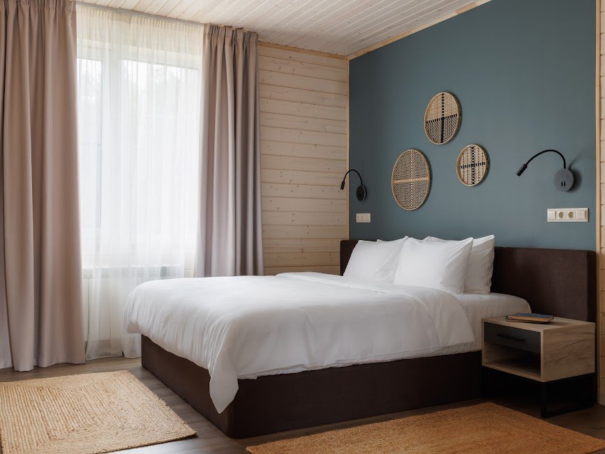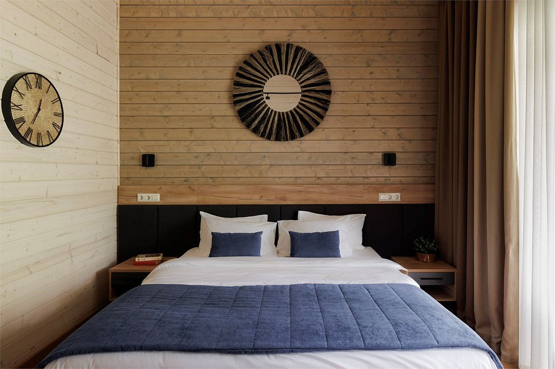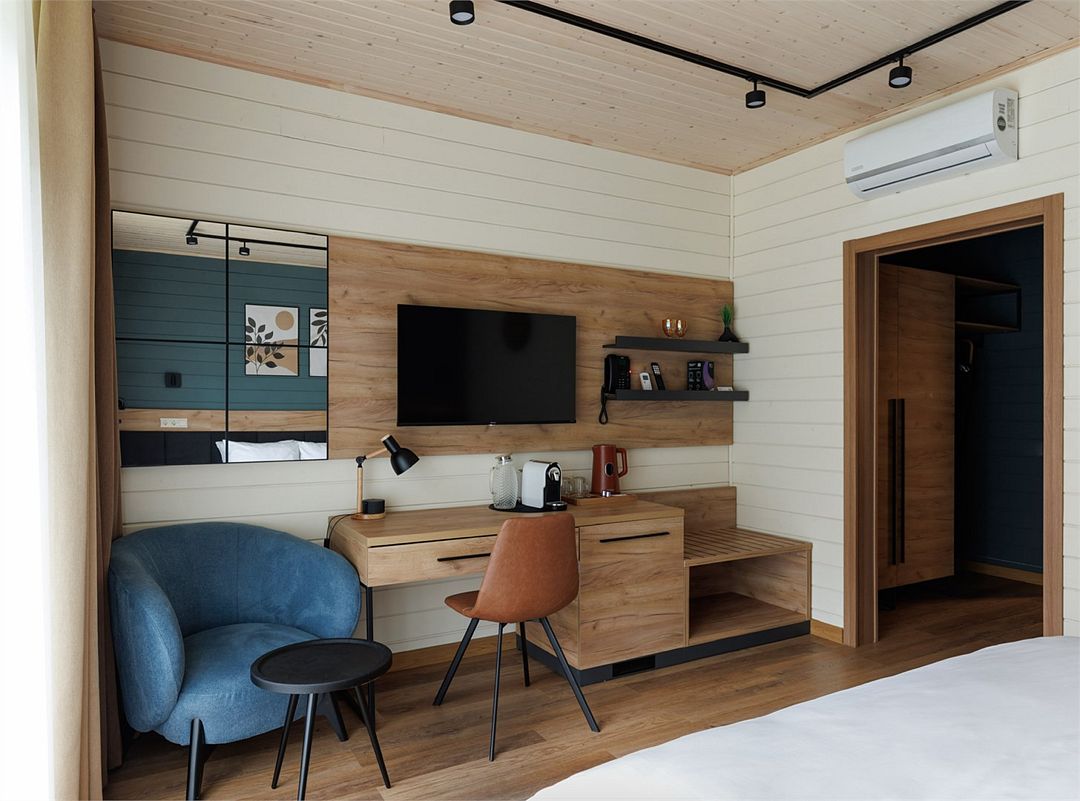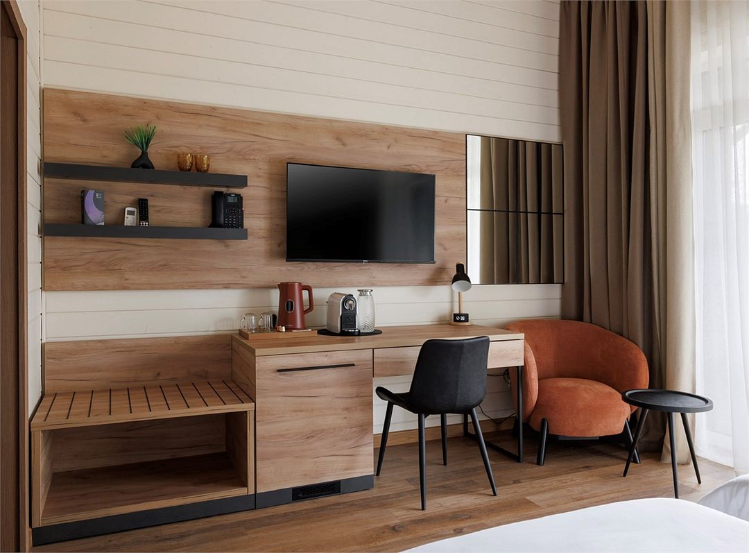 Комфортабельный номер с одной большой двуспальной кроватью. Интерьер номера выполнен в элегантном скандинавском стиле, создавая атмосферу уюта и спокойствия.
