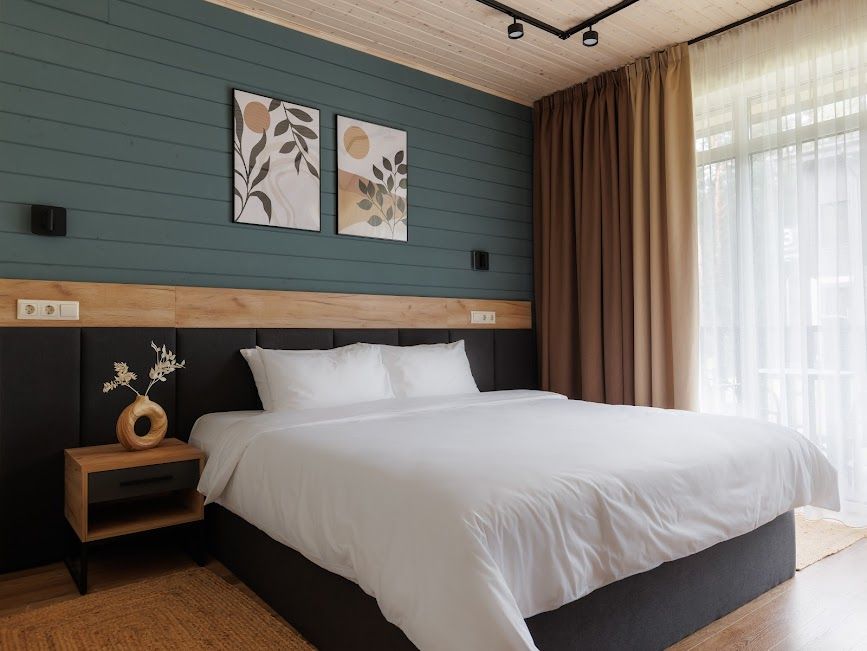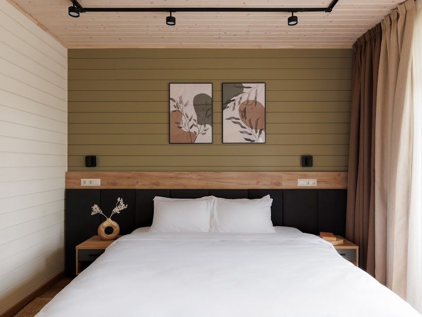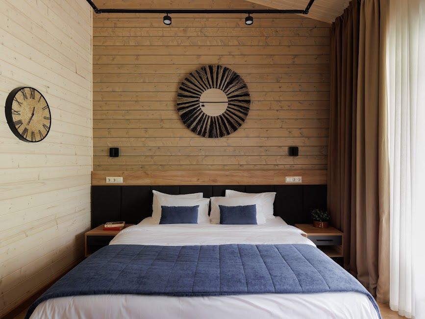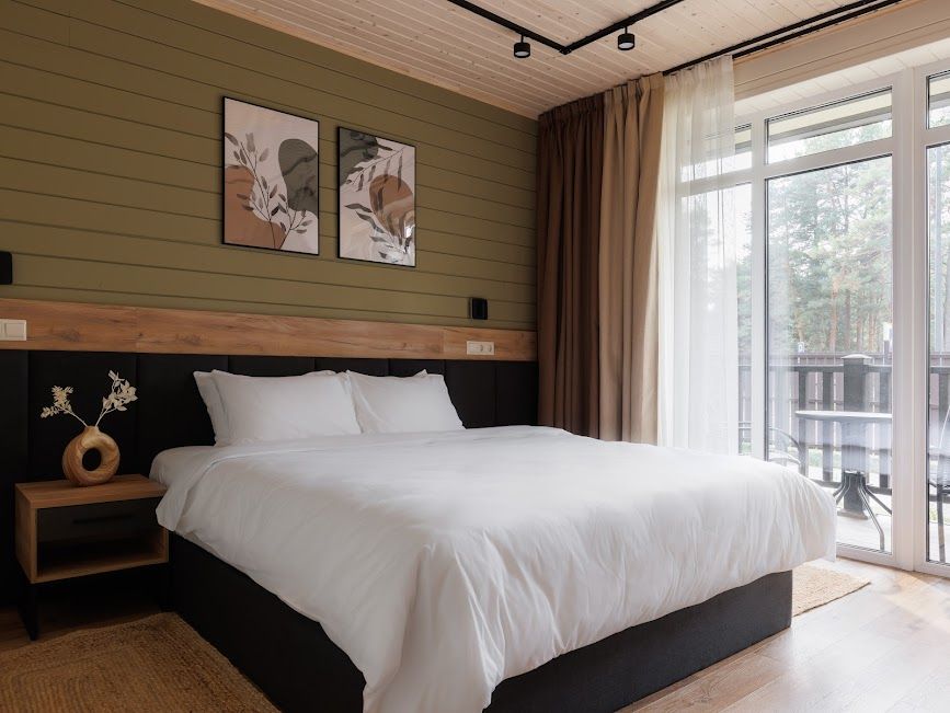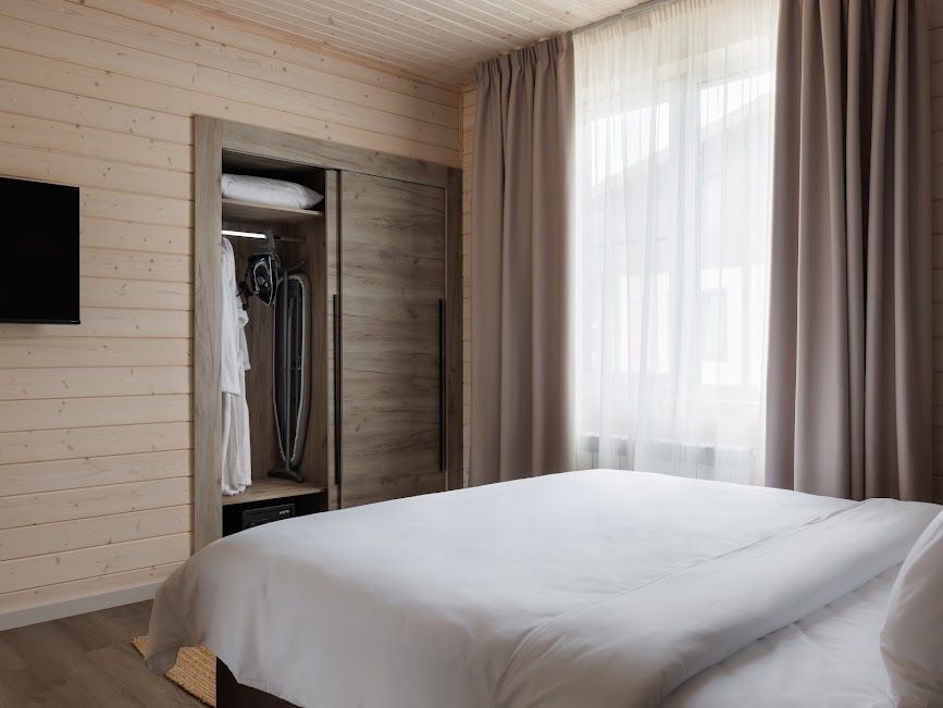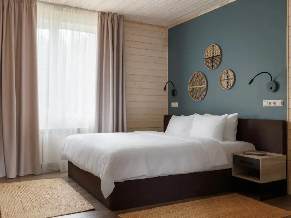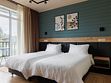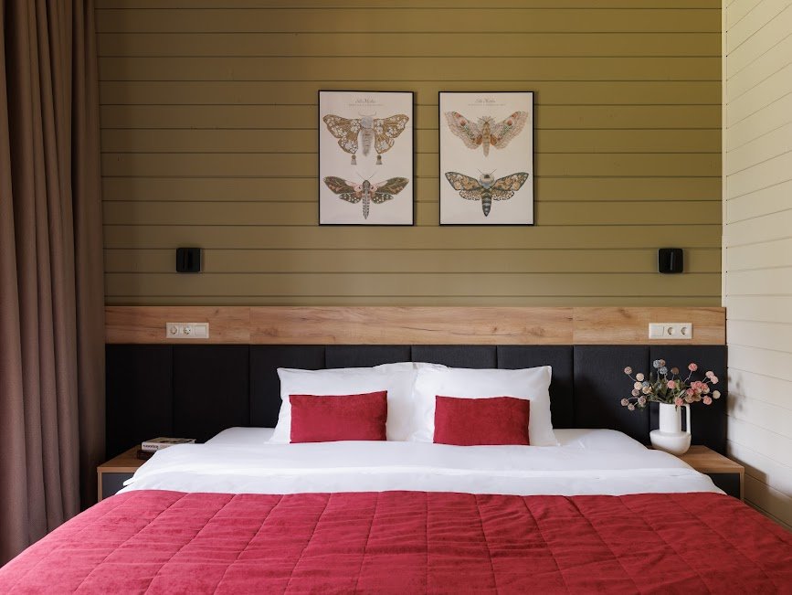 Комфортабельный номер с одной большой двуспальной кроватью. Интерьер номера выполнен в элегантном скандинавском стиле, создавая атмосферу уюта и спокойствия.