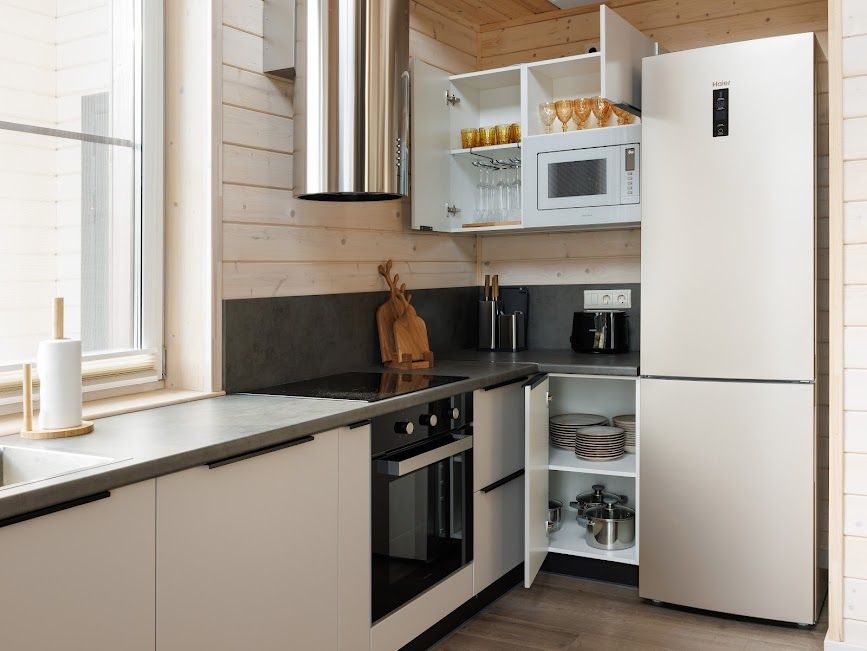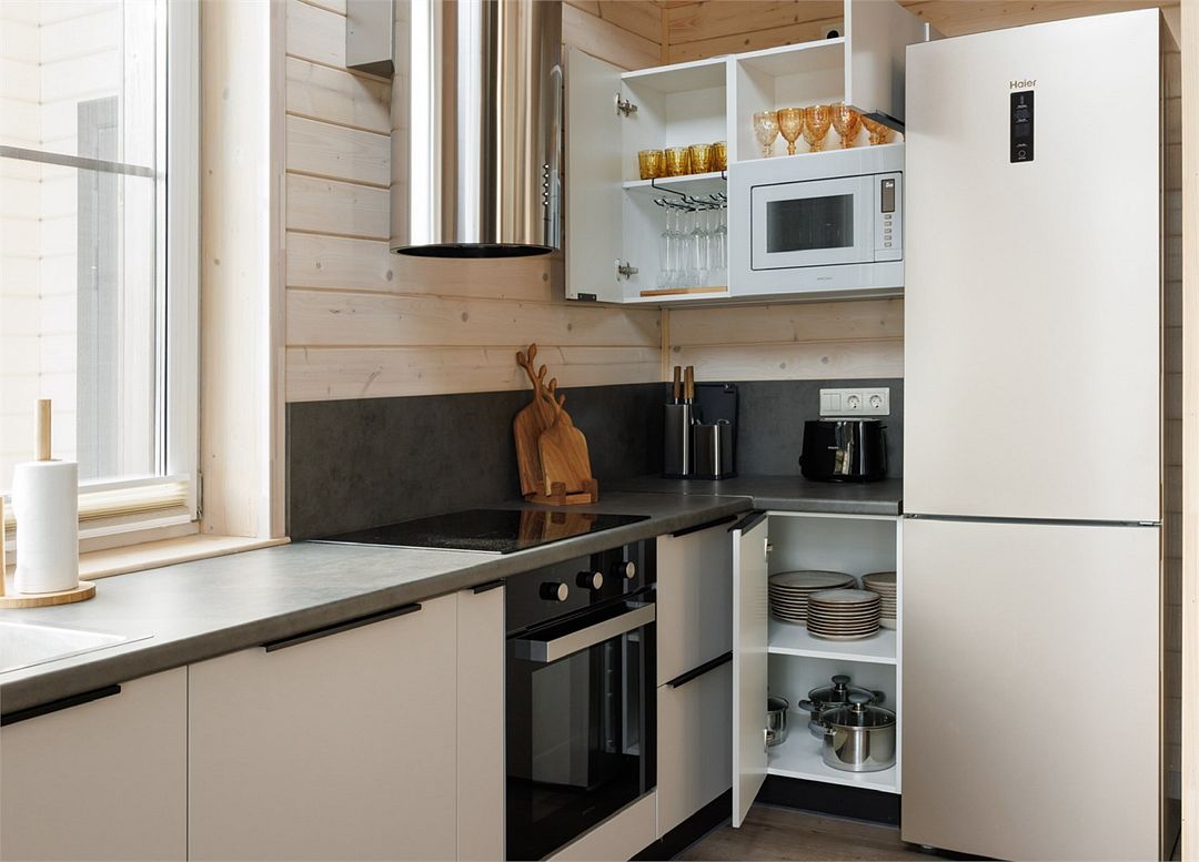 В каждом коттедже есть кухонная зона со всем необходимом. Для гостей, проживающих в номерах предусмотрена общественная кухонная зона.