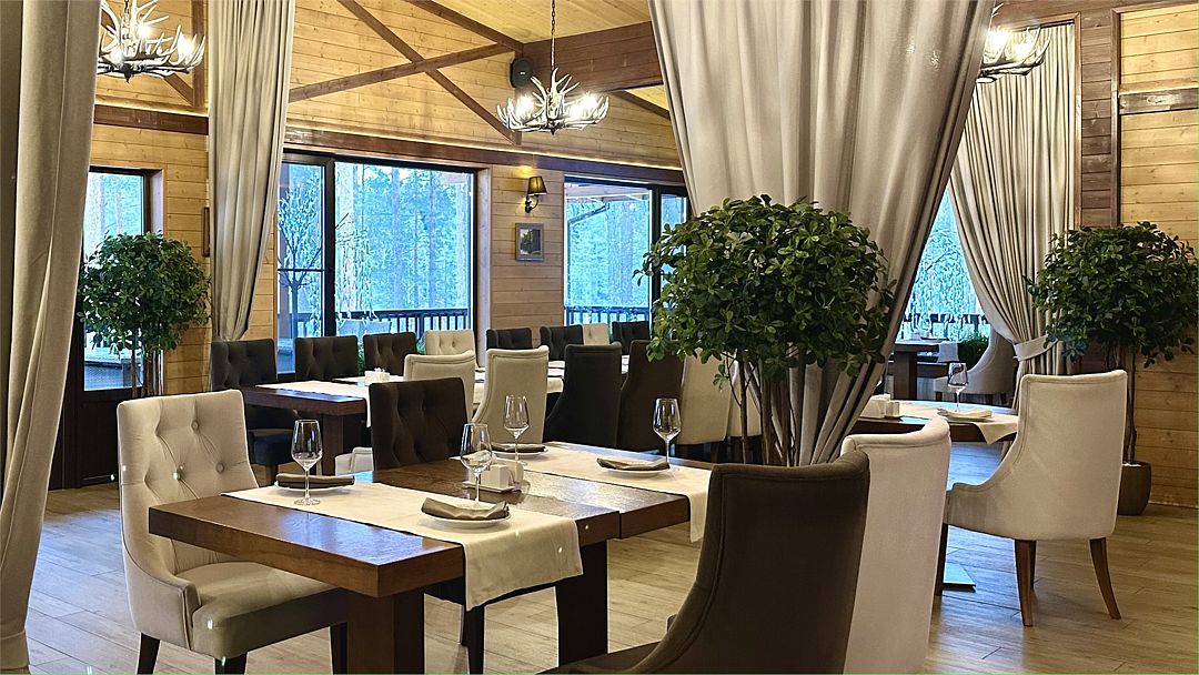Банкетный зал «NaGorke» – визитная карточка курорта «Лесная Рапсодия». Зал расположен на высоком песчаном берегу озера, откуда открывается потрясающий вид на закат.