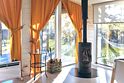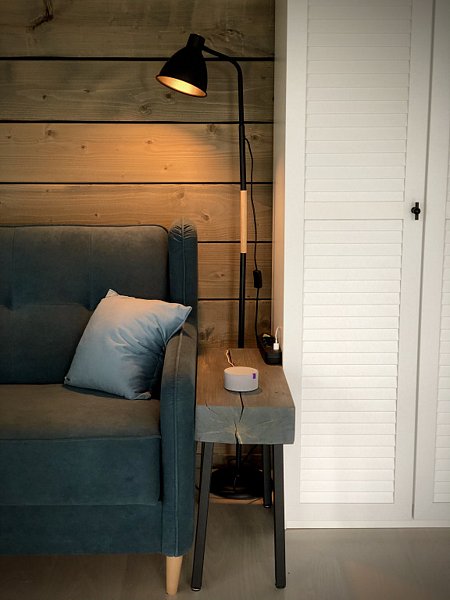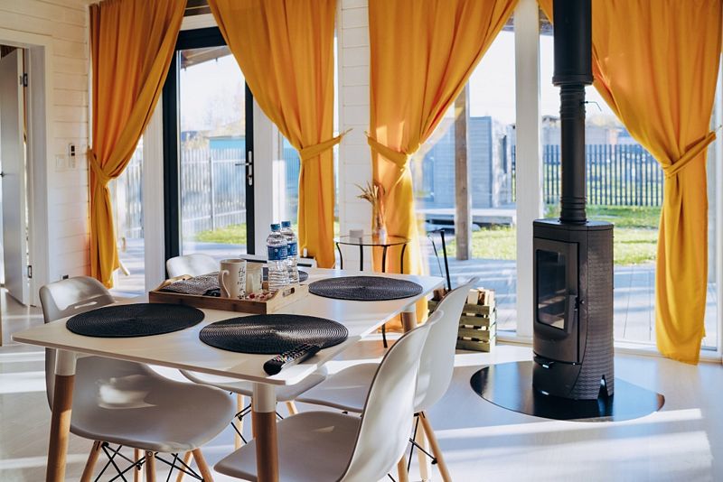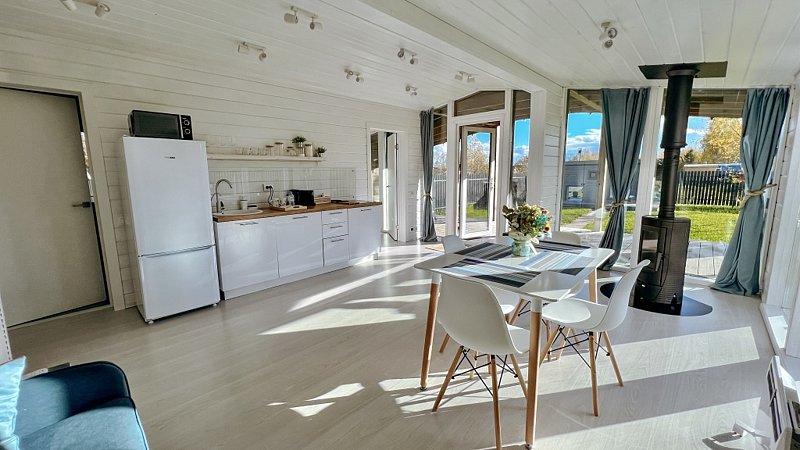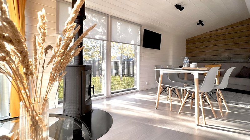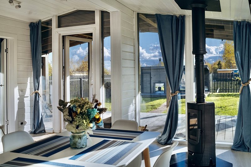 В номере есть телевизор с подключённым Смарт ТВ и подпиской на онлайн кинотеатр. Имеется встроенная кухня с необходимым для приготовления еды, дровяная печь-камин с панорамным стеклом, настольные игры.