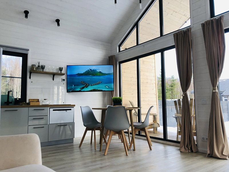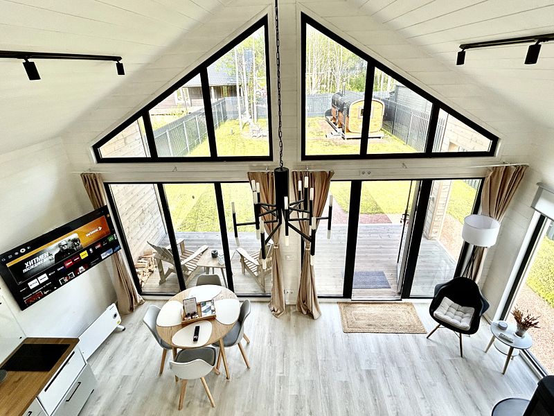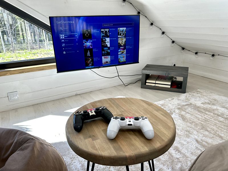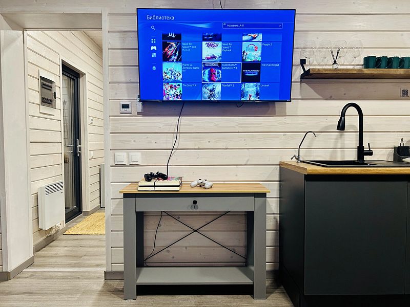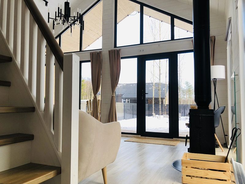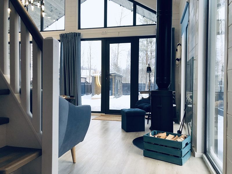 В доме есть панорамные окна, камин, терраса. На первом этаже и на втором лофт-этаже находятся двуспальные кровати, два телевизора с подпиской Кинопоиск (в гостиной и на втором этаже), Wi-Fi, колонка Алиса, настольные игры. Гостям предоставляются полотенца, комплекты постельного белья, шампуни и гели для душа.