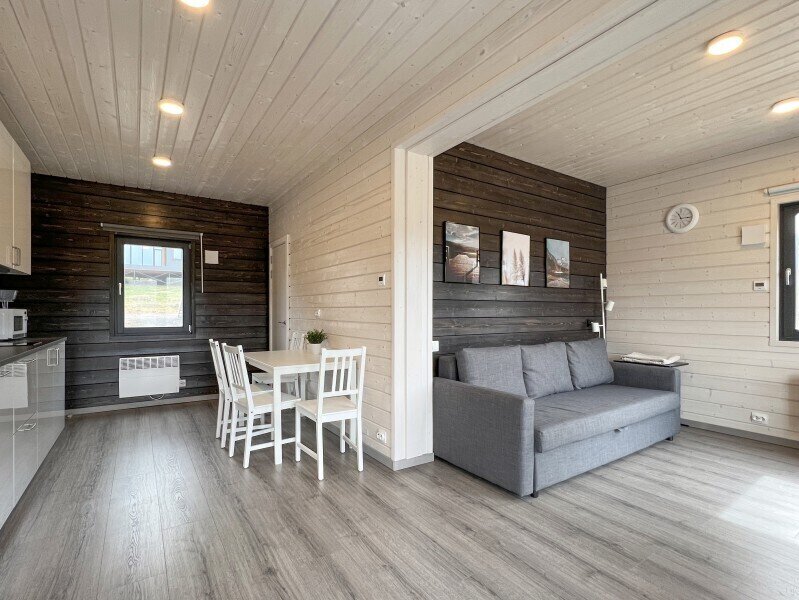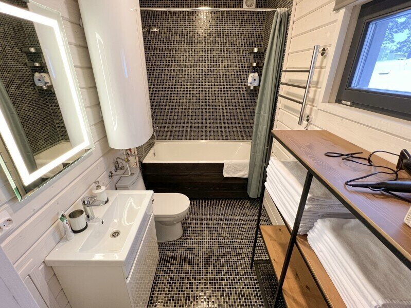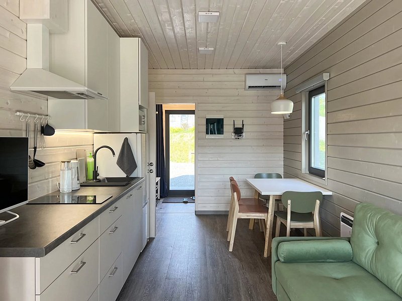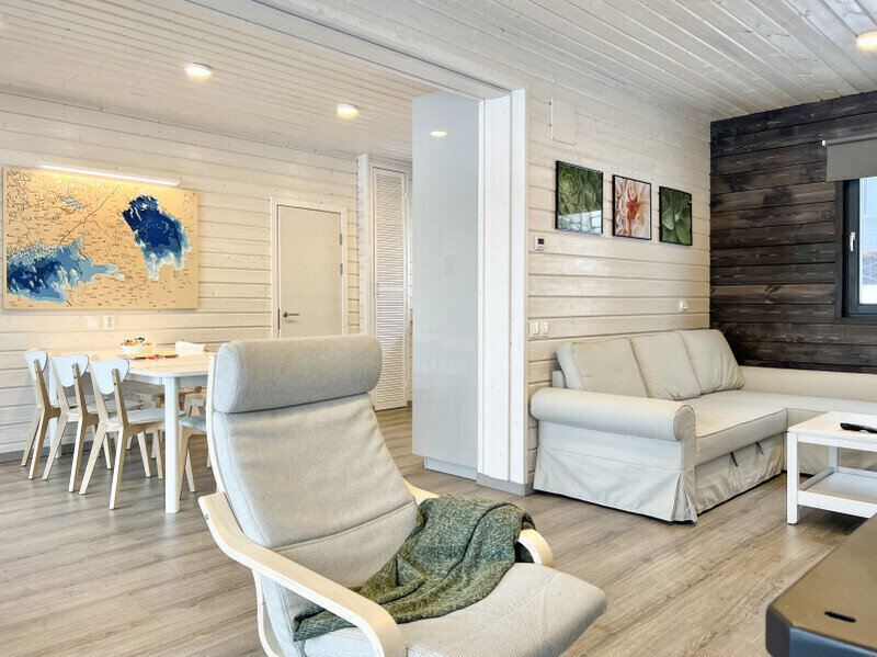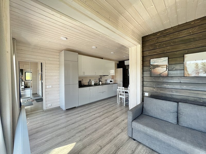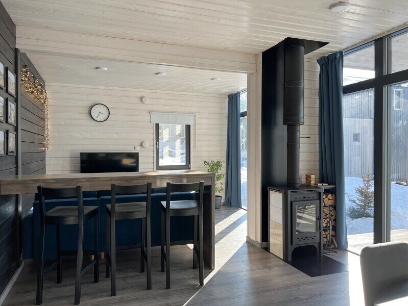 Коттедж с двумя спальнями, кухней со всем оборудованием. В гостиной диван, камин с запасом дров. Два санузла. В гостиной и санузлах теплый пол.