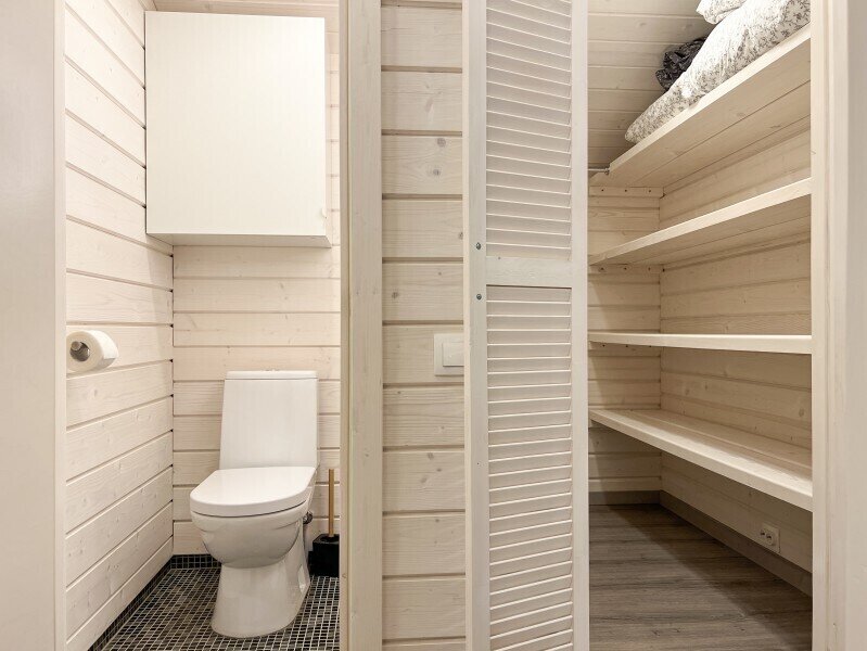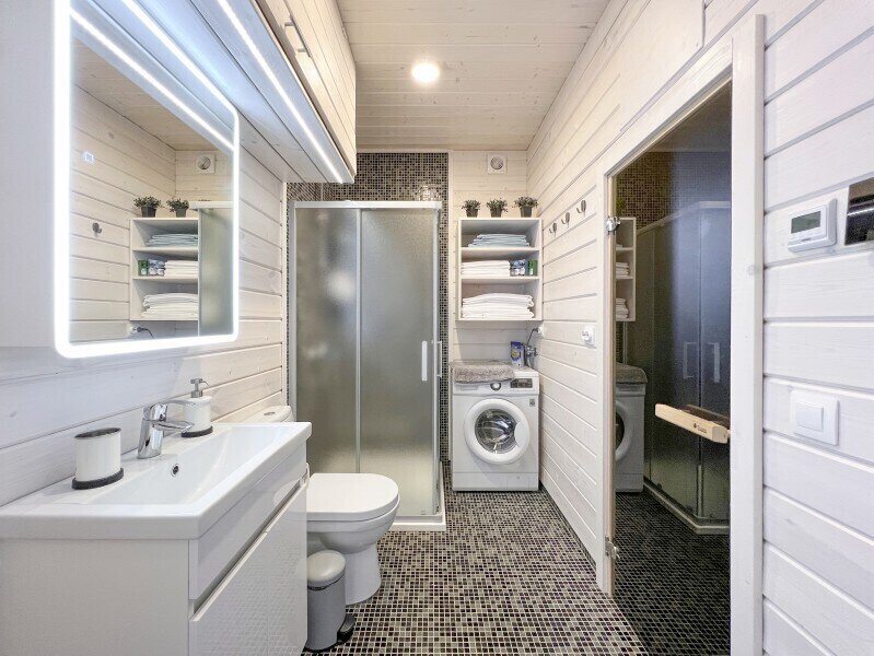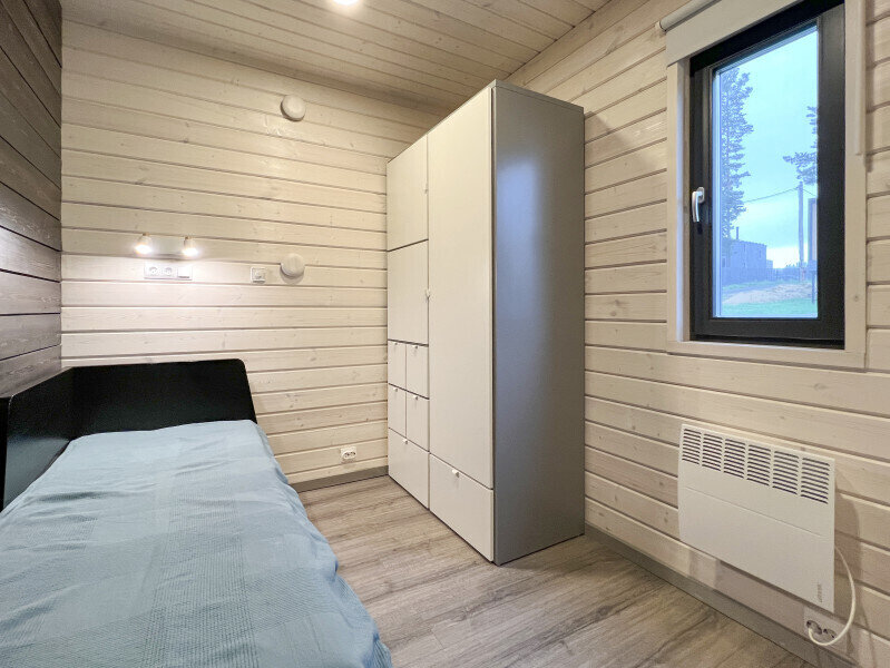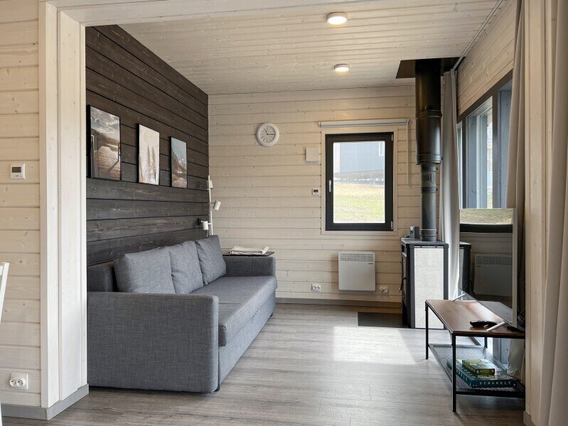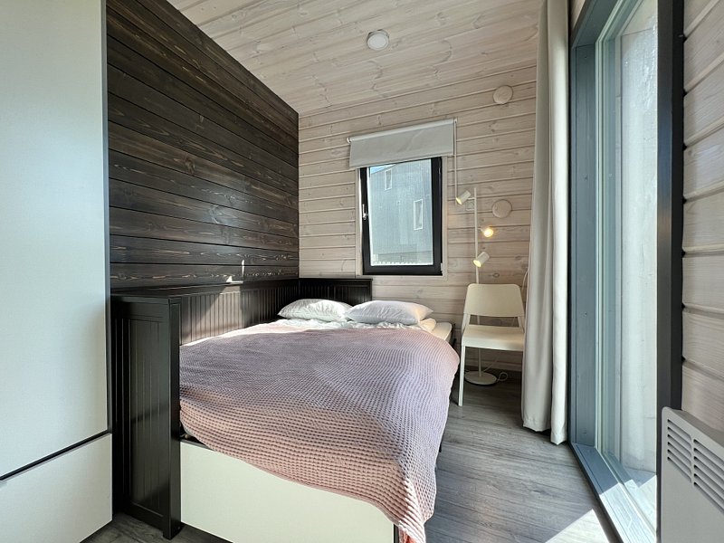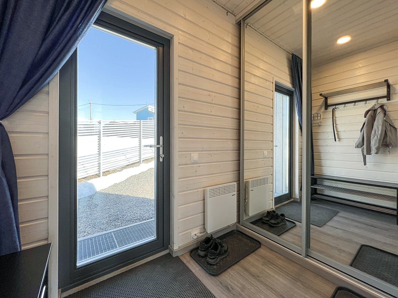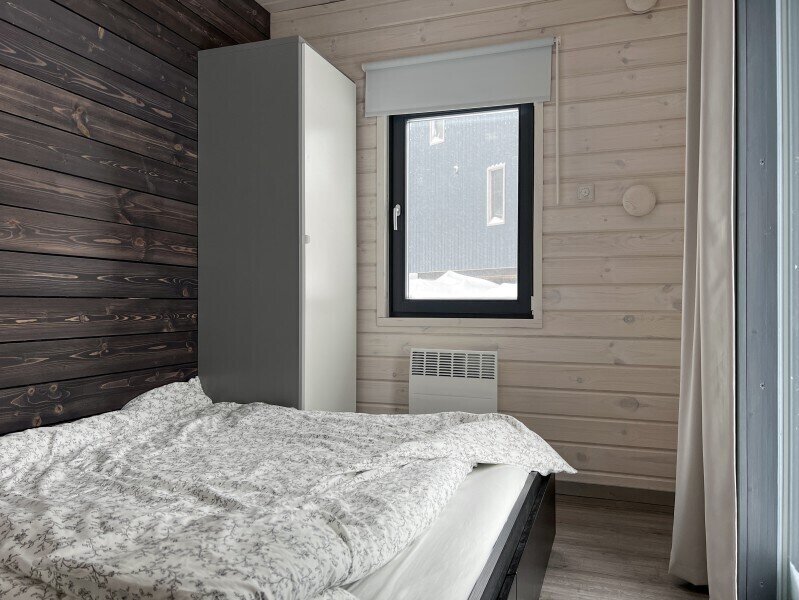 Коттедж с двумя спальнями, кухней со всем оборудованием. В гостиной диван, камин с запасом дров. Два санузла. В гостиной и санузлах теплый пол.