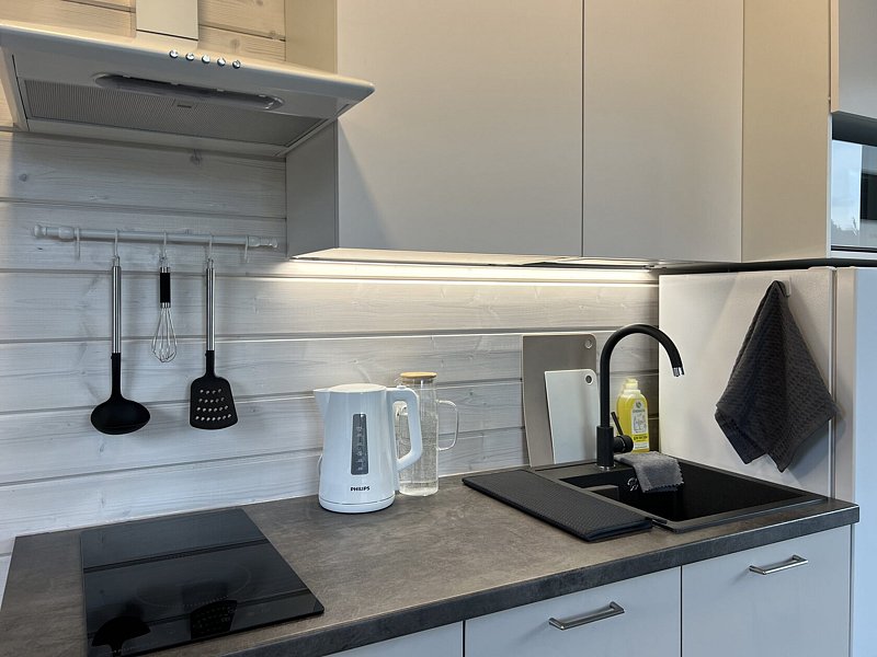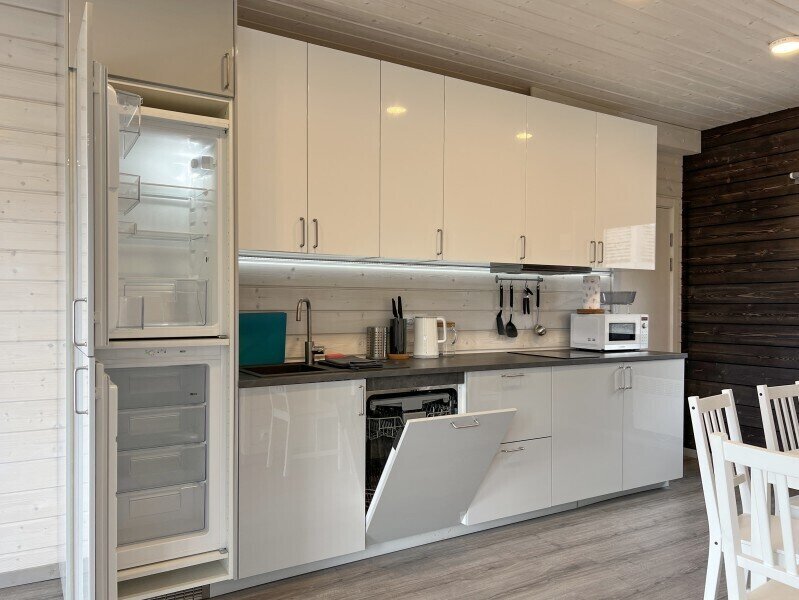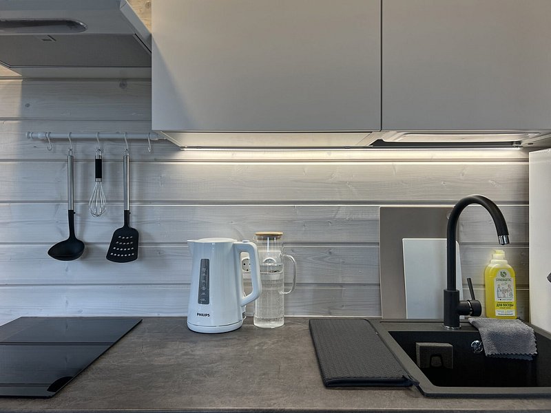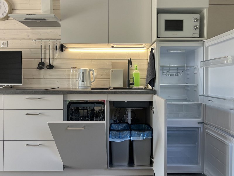 - Оборудованная кухня (холодильник, плита, вытяжка, посудомоечная машина, микроволновка, чайник);