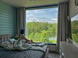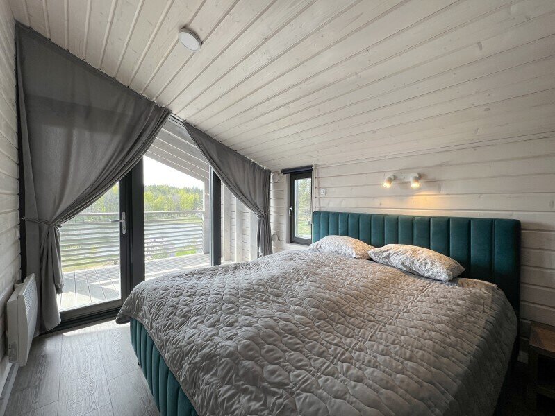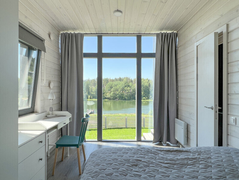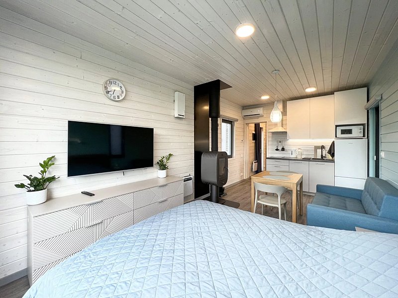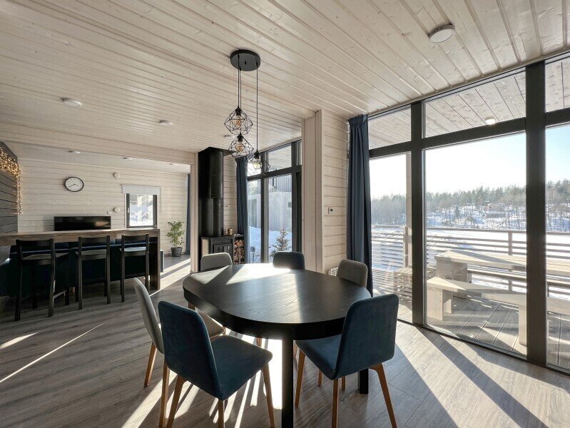 Домик-студия прямо на берегу озера с невероятным видом в большое панорамное окно! А ещё в доме есть просторная сауна на дровах.
