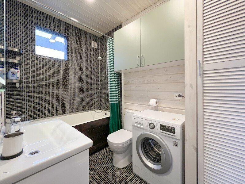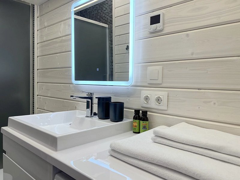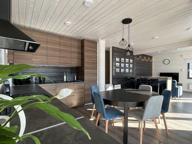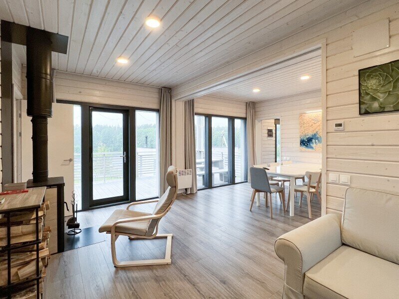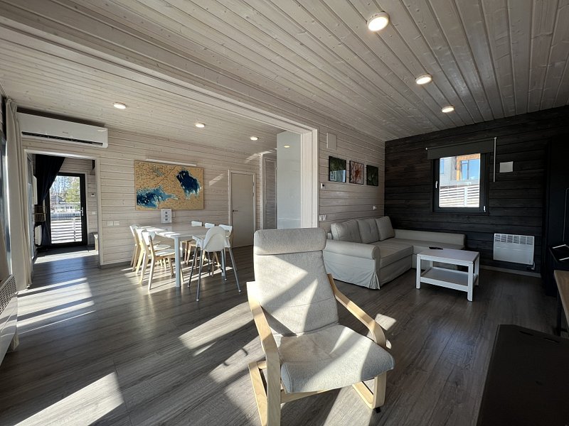 Коттедж с тремя спальнями, кухней со всей бытовой техникой и посудой. В гостиной диван, камин с запасом дров. Два санузла. В гостиной и санузлах теплый пол.