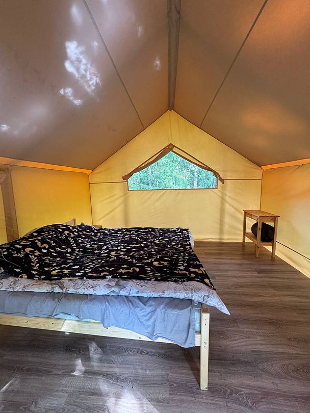 Двухспальный номер в сафари-тенте с возможностью разместить раскладную кровать «Комфорт+» с москитной сеткой, подогревом полов, а также одеялом с подогревом. Подходит для семей, для двух или трех гостей.