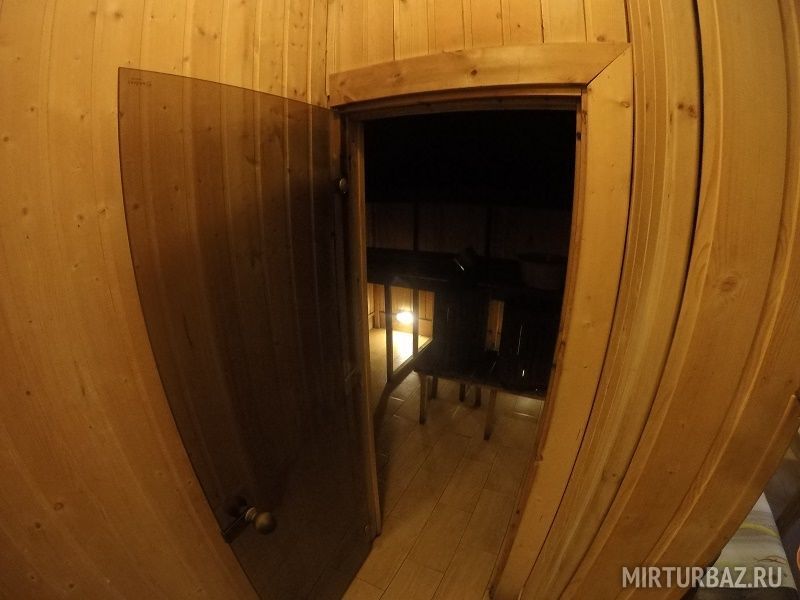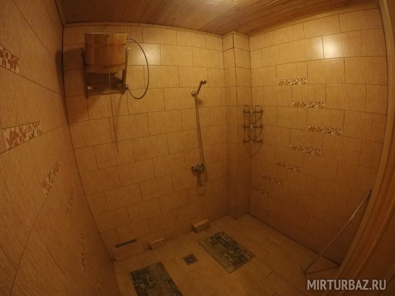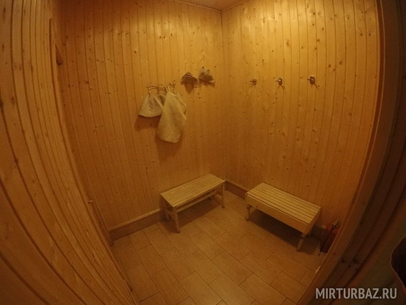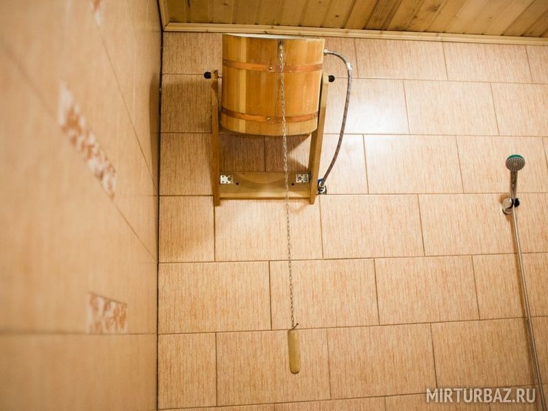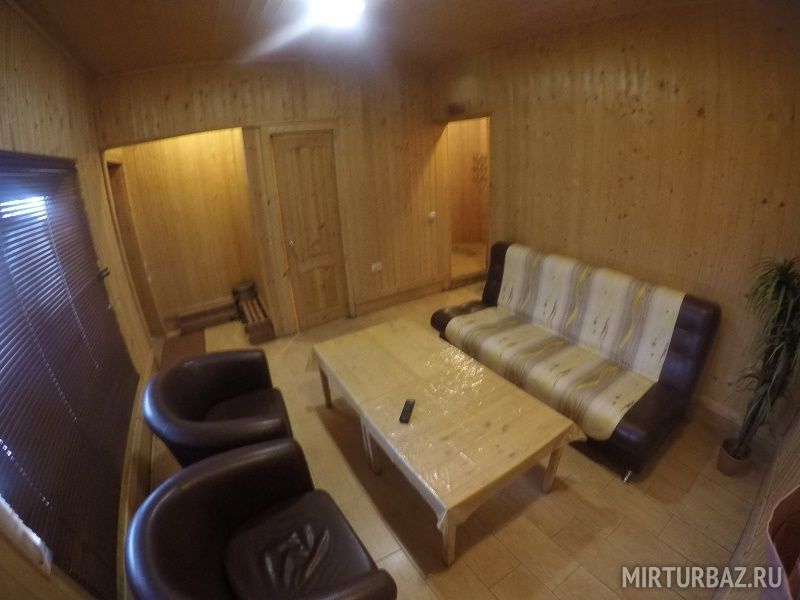 Большой холл с TV и мягкой мебелью, русская парная, обливное ведро, купель.