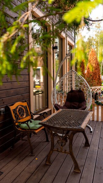 Огромная терраса на 2-м этаже с креслами-шезлонгами и шикарным видом на лес — полное уединение, даже если Вы приехали компанией (подъем на 2-й этаж по лестнице снаружи дома) — для тех, кто хочет побыть в одиночестве со своей второй половинкой. Очень удобный бесключевой доступ везде — электронные кодовые замки для Вашего удобства, не надо брать ключи с собой!