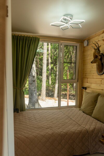 Количество проживающих на 1-м этаже: до 4 человек. 2 отдельные комнаты отдыха (в одной — двуспальная кровать, в другой — две односпальные кровати (спринг-боксы), которые можно соединить в полноценную двуспальную кровать при желании), общая гостиная — кухня, санузел. Во всем доме — панорамные окна в пол. Вид из окна в спальне выходит на живописный лес в паре метрах от окна.