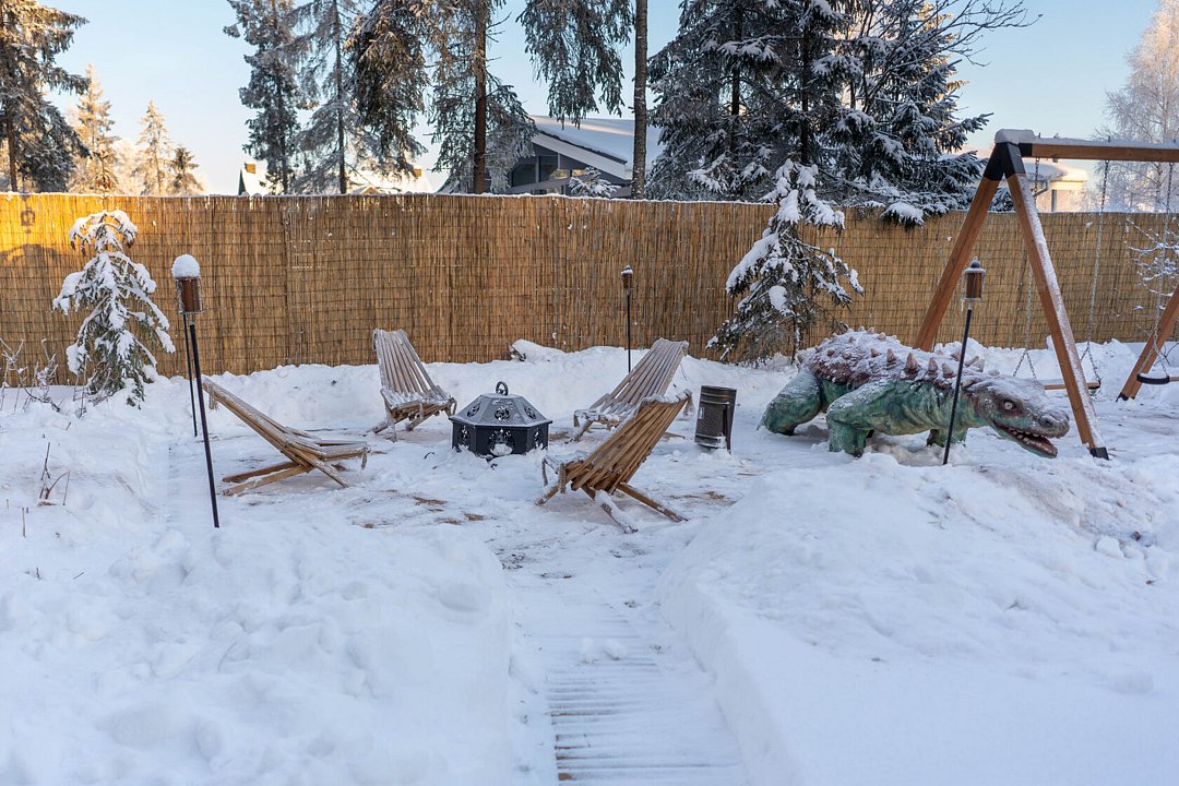 Территория вся освещена, красиво украшена. Именно здесь множество интересных локаций и уникальных фотозон — динозавры, медведь, волк, мостики, качели, беседка.