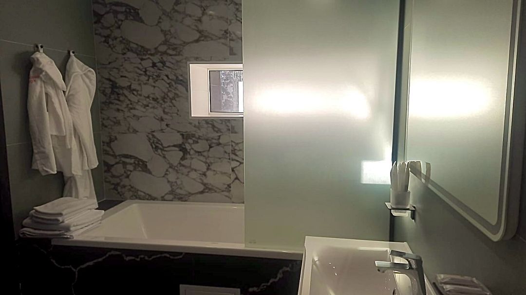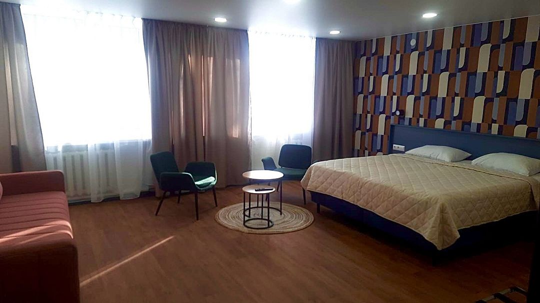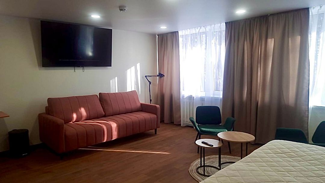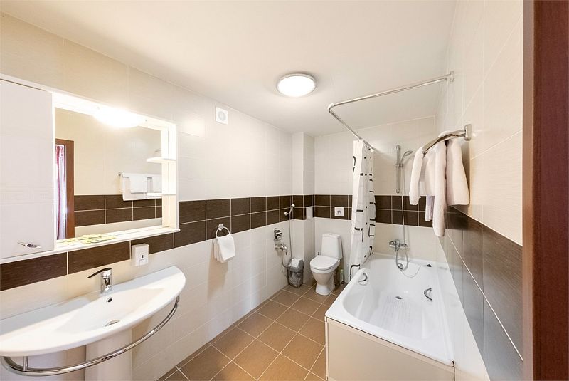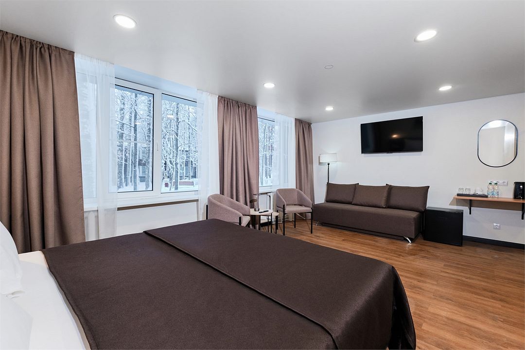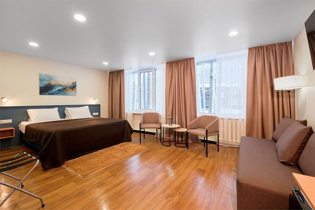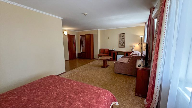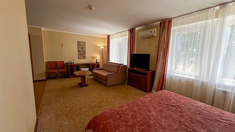 Для путешествующих компанией отлично подойдет номер категории Люкс. В номере одна большая кровать и диван, который может служить дополнительным спальным местом. За счет большой площади номера (36 кв.м.) он разделен на три зоны: прихожая, с тумбочкой для обуви и вешалкой для одежды, гостиная, с раскладным диваном, журнальным столиком и мягкими стульями и спальня. Комната оборудована чайником, холодильником, телевизором, а отдельная ванная комната - ванной и феном. Халаты предоставляются бесплатно в номерах данной категории.