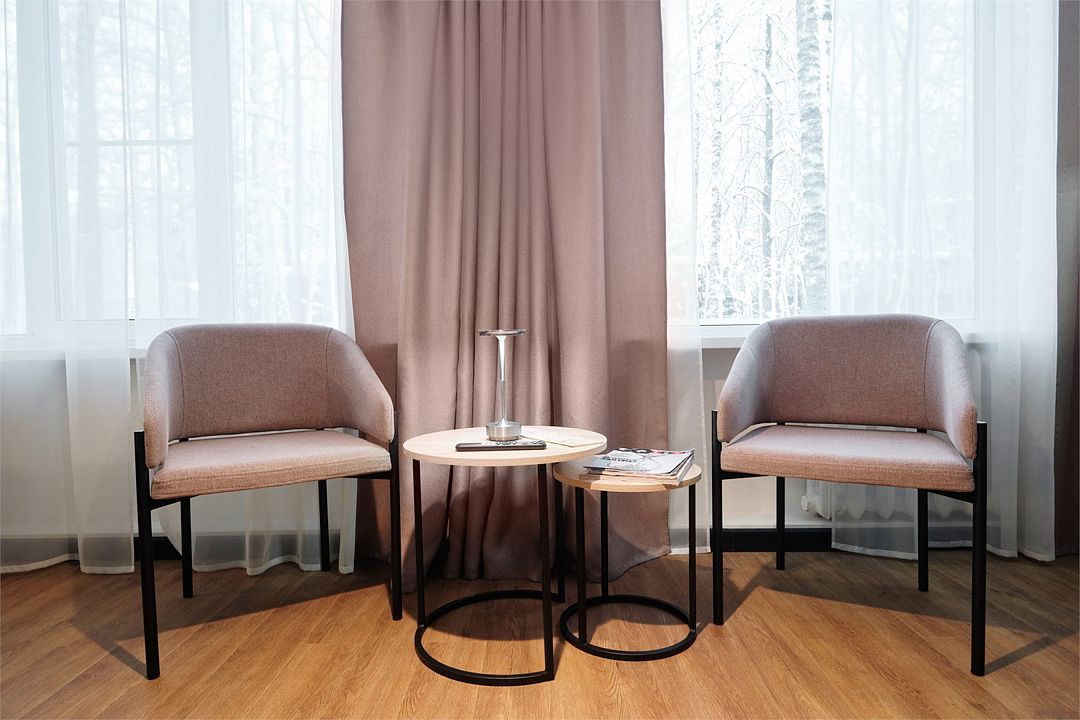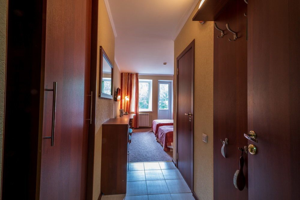 Для путешествующих компанией из трех человек отлично подойдет номер категории полулюкс, которые расположены во 2, 4 и 5 корпусах. В номере одна большая кровать, в некоторых есть диван, который может служить дополнительным спальным местом для одного человека. За счет большой площади номера (27 кв.м.) он разделен на три зоны: прихожая, с тумбочкой для обуви и вешалкой для одежды, гостиная, с раскладным диваном, журнальным столиком и мягкими стульями и спальня. Комната оборудована чайником, холодильником, телевизором, а отдельная ванная комната - ванной и феном. Халаты и полотенца предоставляются бесплатно в номерах данной категории.
