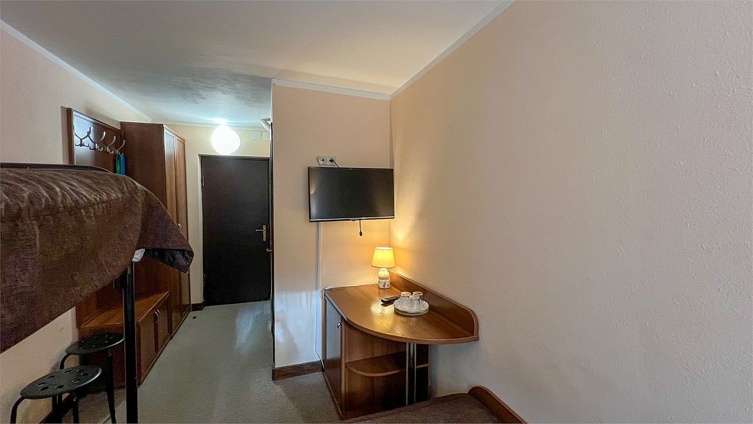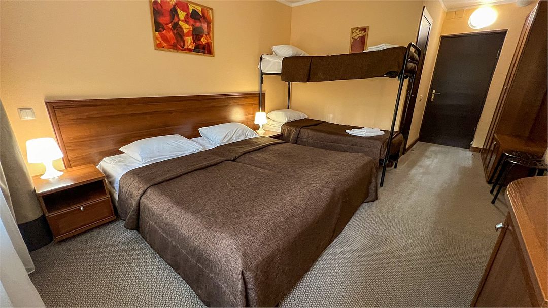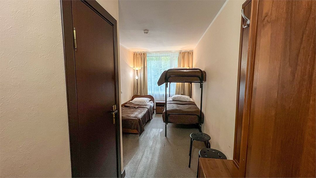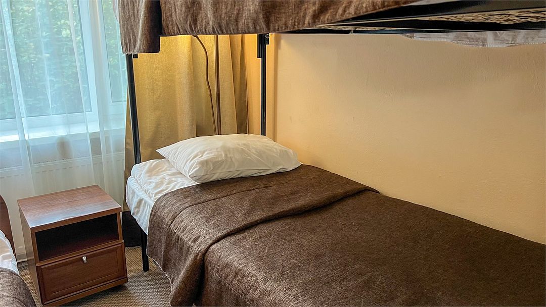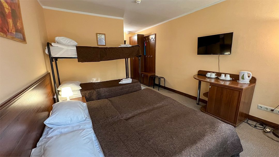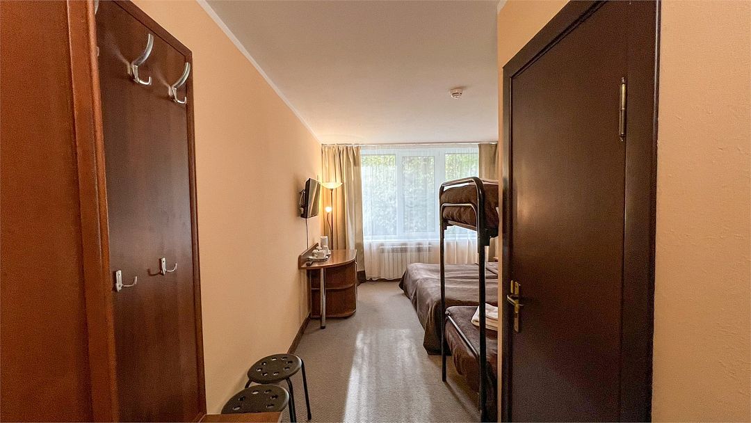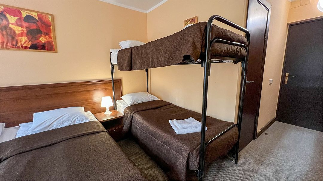 Трехместный номер с 1 односпальной кроватью и 1 двух-ярусной кроватью подойдет для проживания как семьи, так и для группового проживания.