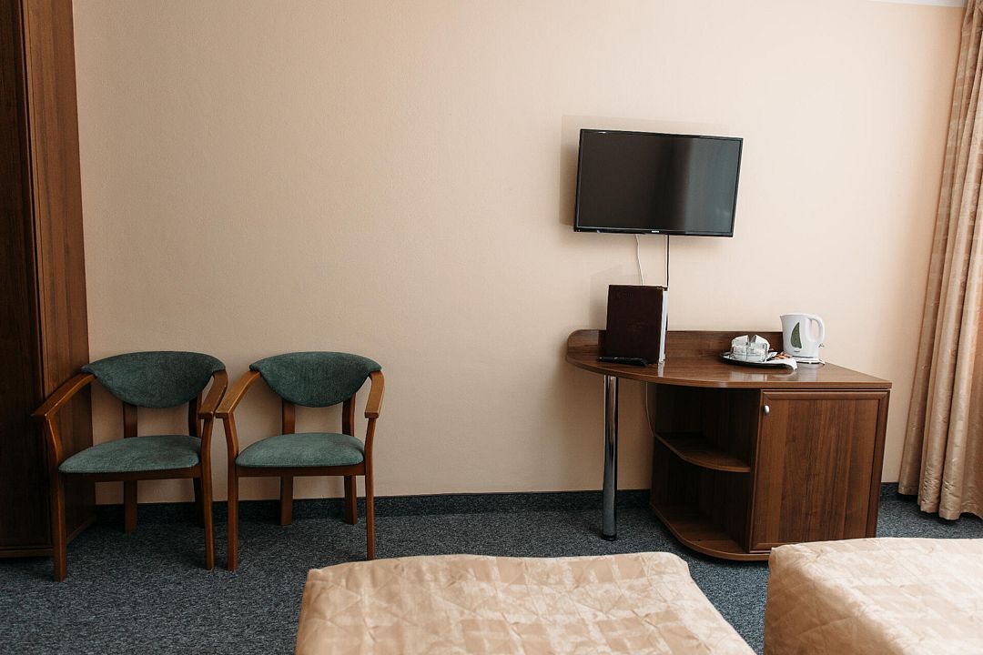 Он подойдет для проживания двух человек. В комнате имеется все необходимое: телевизор, холодильник, прикроватные тумбочки. В ванной комнате данной категории номеров располагается душ.