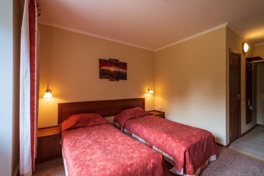 Просторный номер категории «Улучшенный Стандарт» с двумя односпальными кроватями, которые можно объединить в 1 двуспальную кровать.