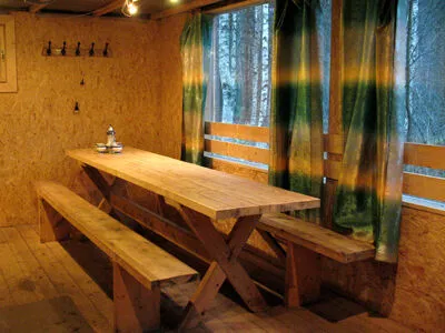 Два коттеджа на 12+4 человек каждый (коттедж №1 и №2) 1й этаж: гостевая – спальня с камином (телевизор, DVD проигрыватель с караоке, 3 двуспальных дивана), кухня (микроволновая печь, газовая плита, холодильник с морозилкой), умывальник и мойка для мытья посуды (горячая и холодная вода), питьевая вода из родника – 30л.) 2й этаж: гостевая - спальня (4 двуспальных дивана и 2 односпальных).