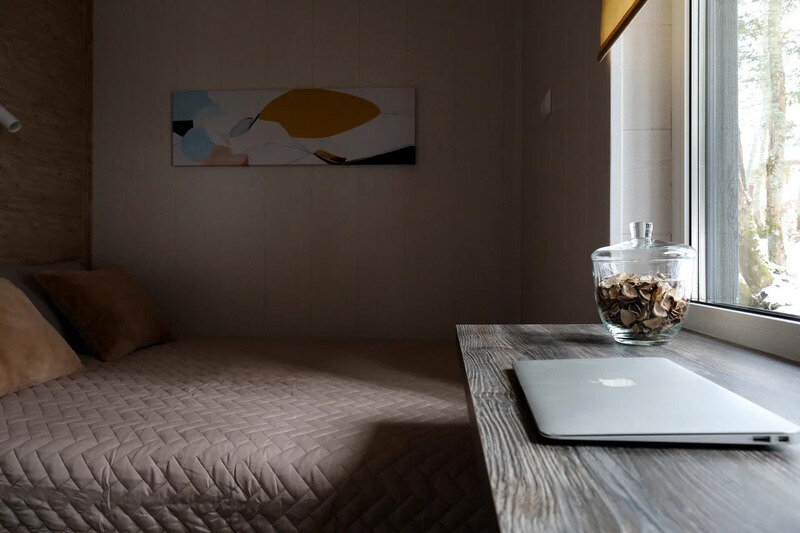 Дом расположен в коттеджном поселке «Лисичкино-Боброво», до которого можно доехать всего за 30 минут от Санкт-Петербурга на автомобиле и в 30 километрах от «Парнас Мега». Чтобы добраться до дома, нужно проехать всего 2 километра по лесной дороге. Здесь атмосфера очень тихая и лишена городского шума.