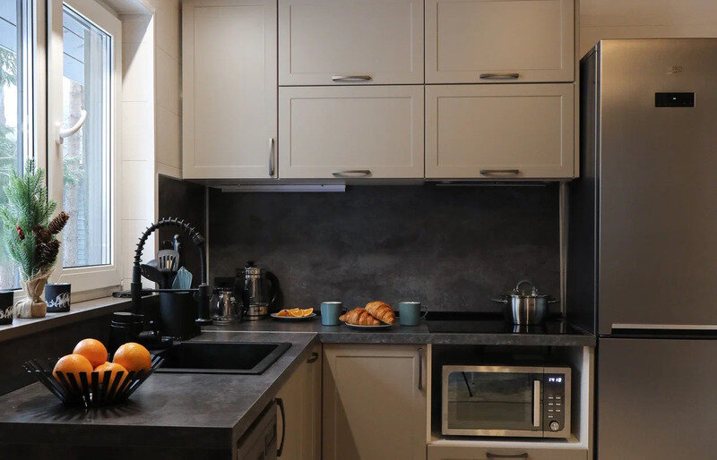 - кухня-камин, посудомоечная машина, СВЧ, холодильник, чайник, плита, посуда