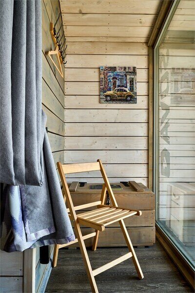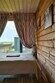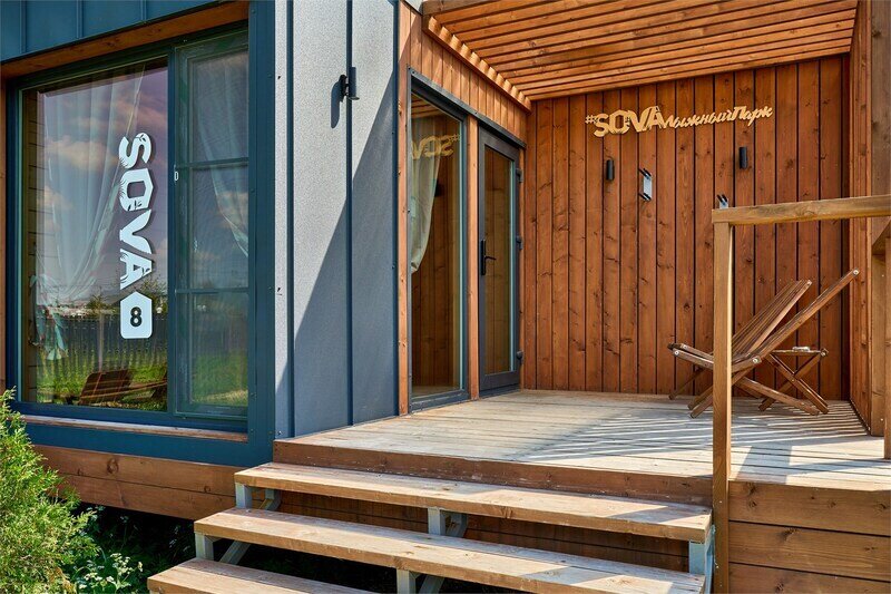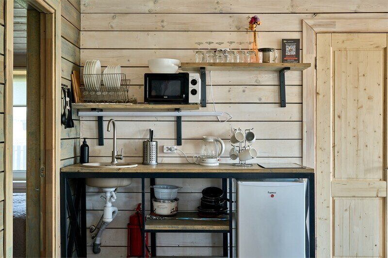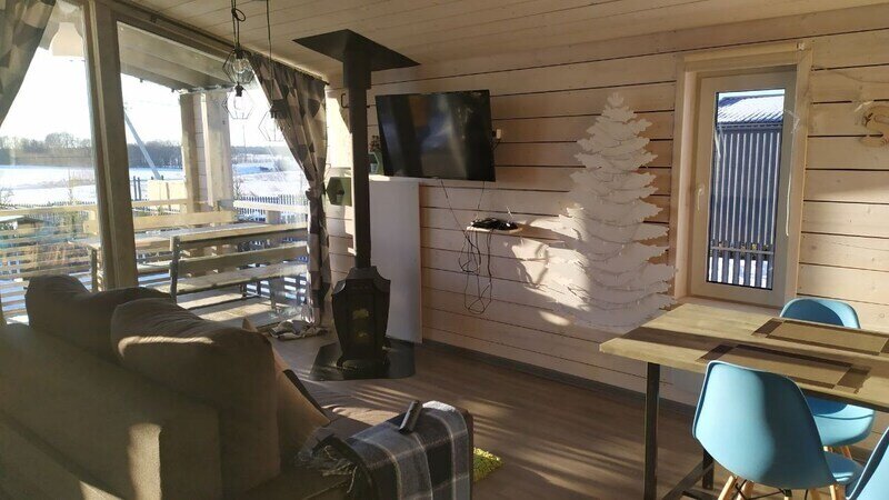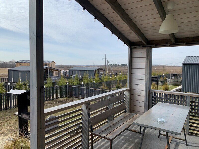 В банном доме есть кухонная зона с кулером, микроволновой печью, чайником и посудой, гостиная зона с панорамными окнами, столом, диваном и телевизором. Совмещенный санузел. Крытая терраса с уличной мебелью.