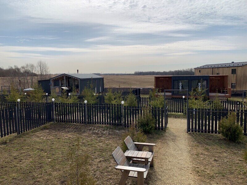 Линия состоит из 5ти коттеджей, с камином, с панорамными окнами на террасе, с видом на частный сектор.