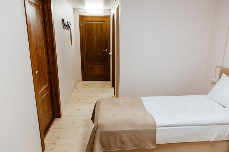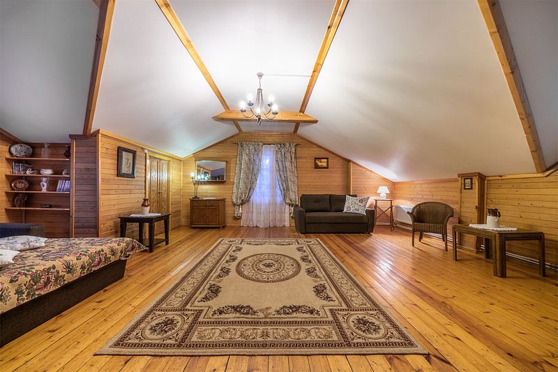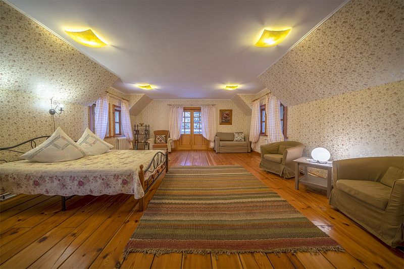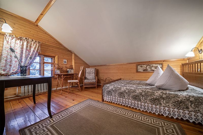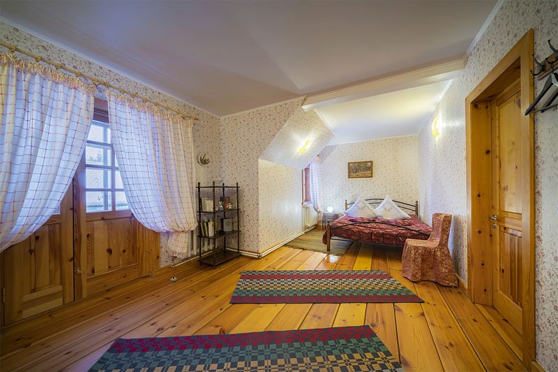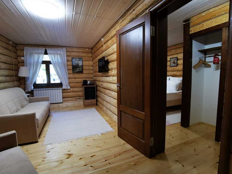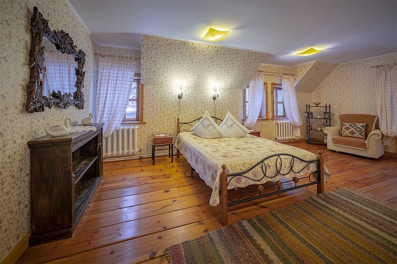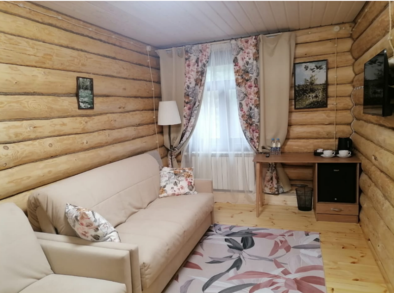 Двухкомнатный номер Люкс расположен в корпусе гостиницы под названием «Трактир». Номер подойдёт для комфортного размещения семьи. Мягкая мебель в гостиной может быть использована в качестве дополнительного размещения.