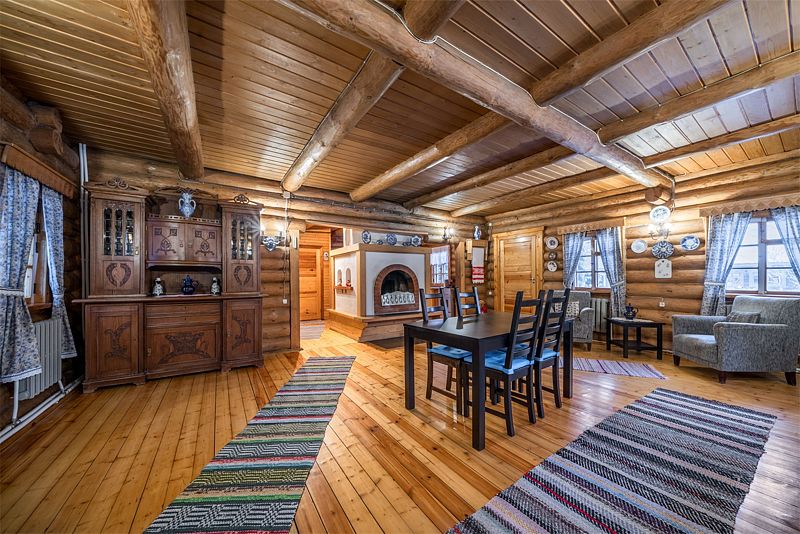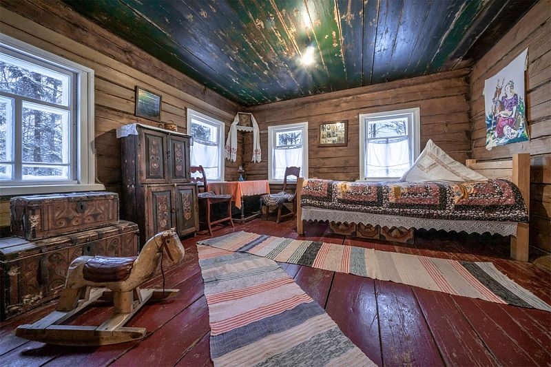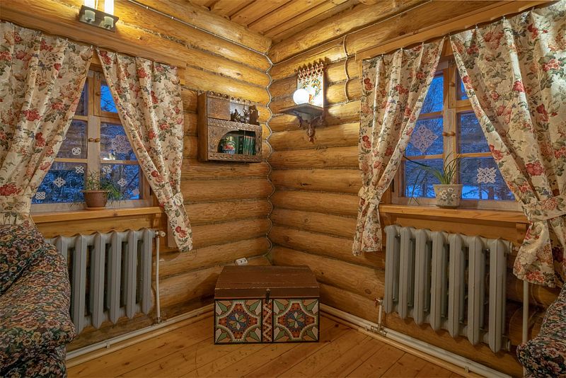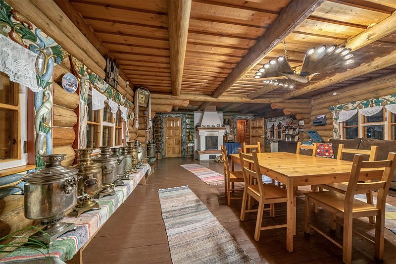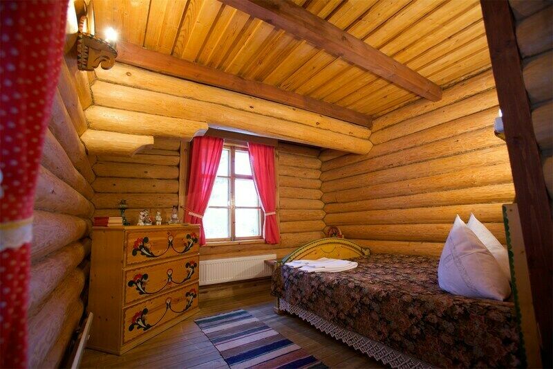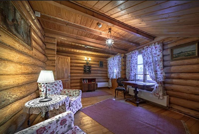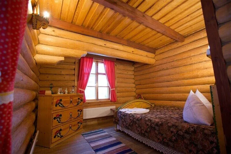 В номерах предусмотрена необходимая мебель для отдыха, есть электрический чайник, мини-холодильник и собственный санузел с душем и туалетными принадлежностями. В домах дополнительно оборудованы уютные гостиные с камином и телевизором. Интерьер в избах выполнен согласно настоящему крестьянскому быту. В усадьбе обустроен причал к реке, есть собственная бильярдная.