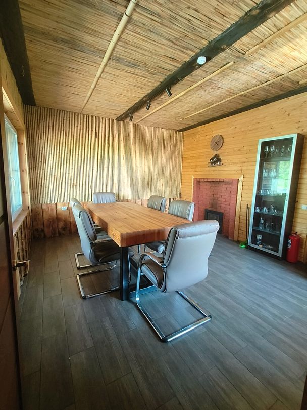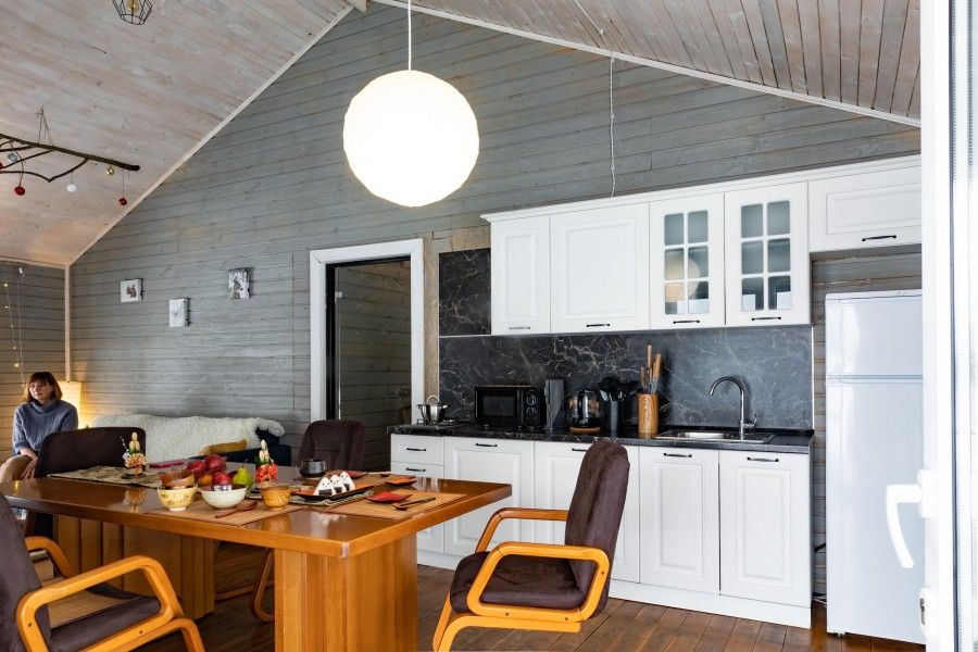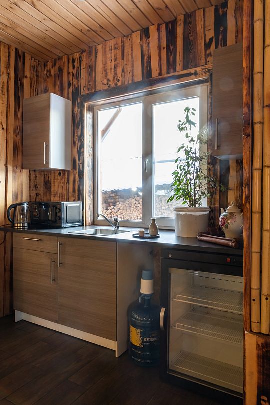 Просторная зона отдыха с камином и кухней. На кухне есть электрический чайник, микроволновая печь, посуда. В течении всего пребывания в банном комплексе, вы можете воспользоваться крытой беседкой с мангалом для приготовления блюд на углях.