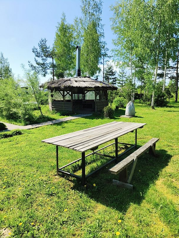 Беседка с мангалом и кухня гостиная на 6-8 человек. Туалет, вода, посуда, электрический чайник, микроволновая печь, холодильник.