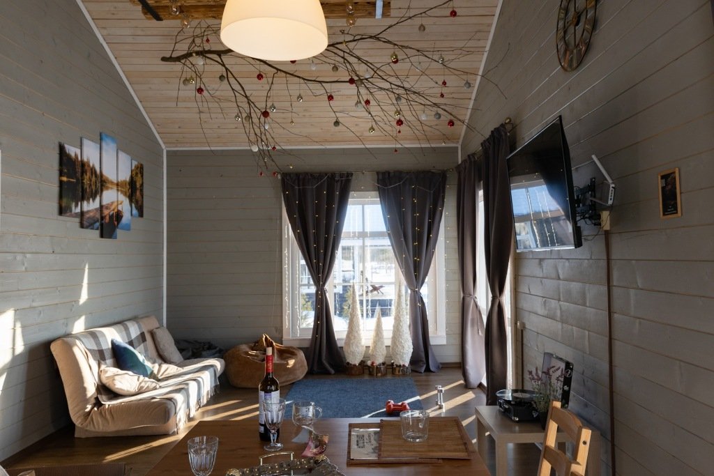 Гостиная: камин (дрова входят в стоимость аренды), панорамные окна, крытая терраса, шезлонги