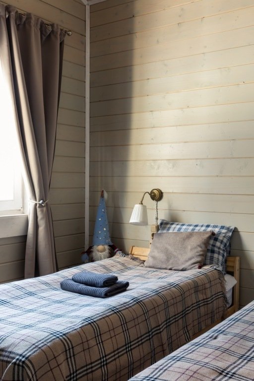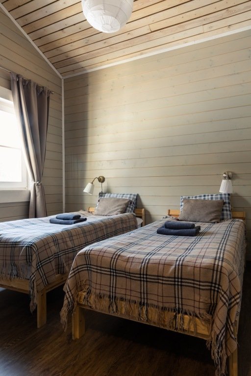 2 спальная комната: 2 односпальные кровати 90*200, ванная комната (раковина, унитаз, душевая панель), фен, мыло, шампунь, гель;