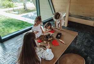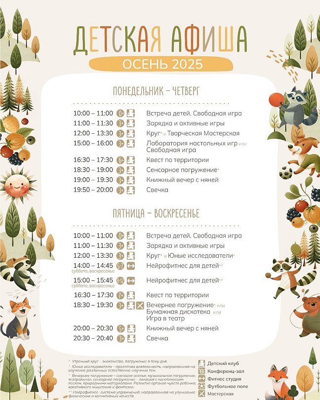 Игровая зона предназначена для детей в возрасте от трех до двенадцати лет, а заботливые аниматоры делают занятия увлекательными и развивающими. Для более старших детей предусмотрены походы по природному парку, турниры по настольным играм и возможность завести новых друзей.