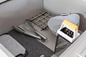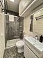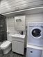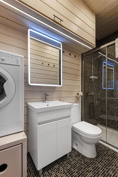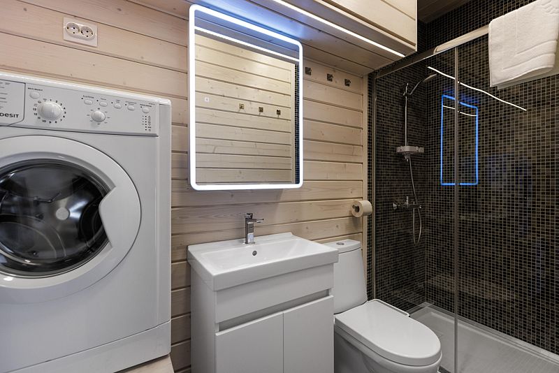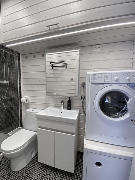 Санузел с душевым уголком, фен, стиральная машина, средства гигиены.