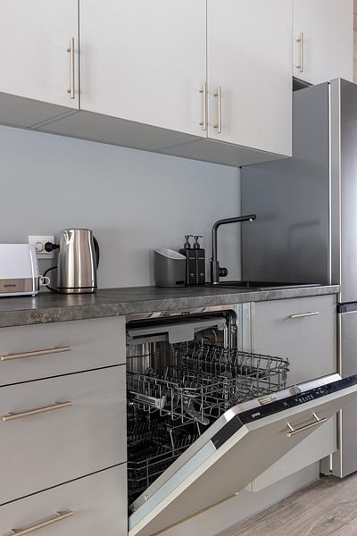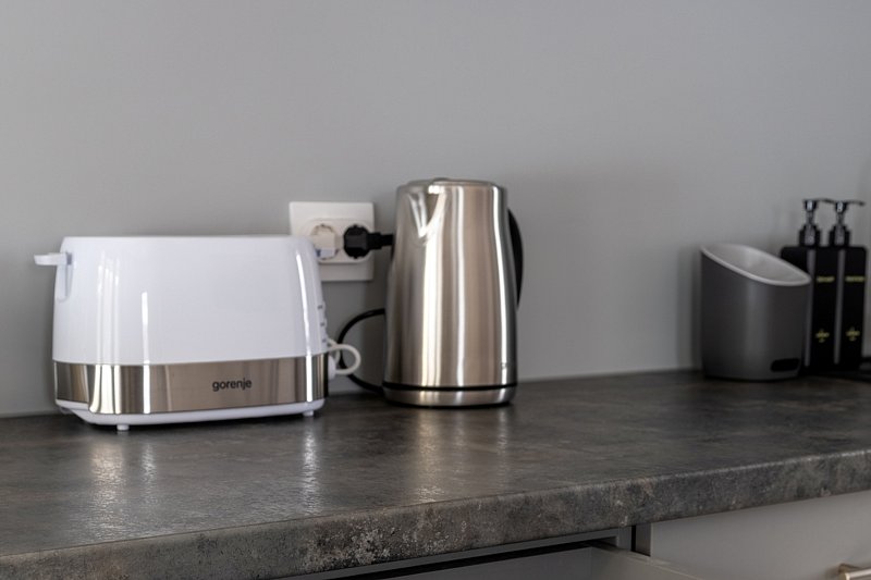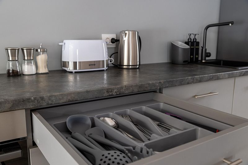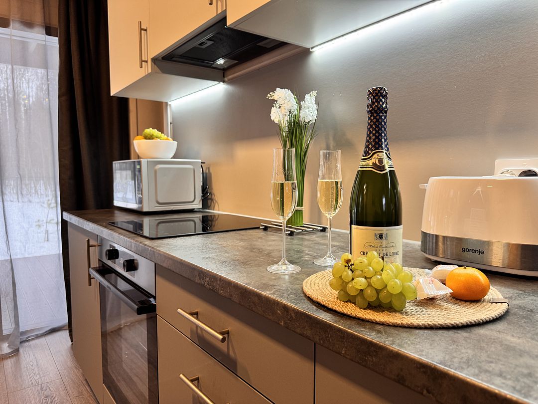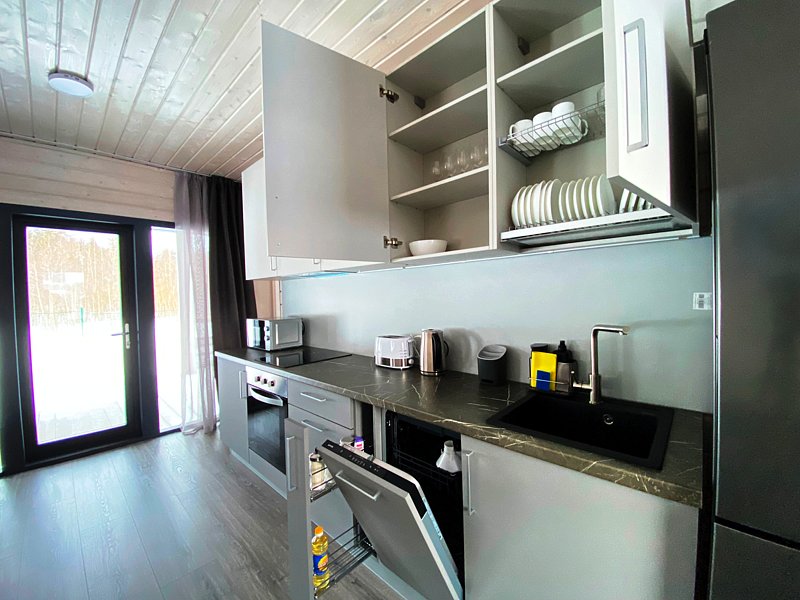 Оборудованная кухня (холодильник, плита, вытяжка, микроволновка, тостер, чайник, посудомоечная машина, вся необходимая посуда и кухонные принадлежности, для готовки есть масло, соль, сахар, специи).