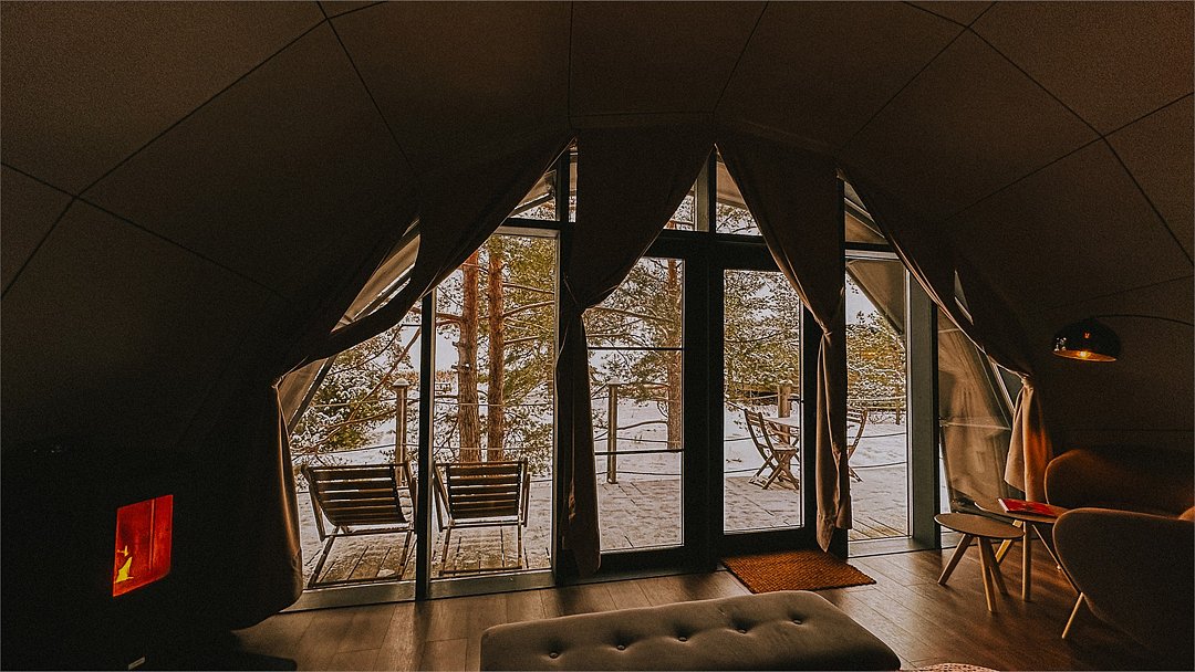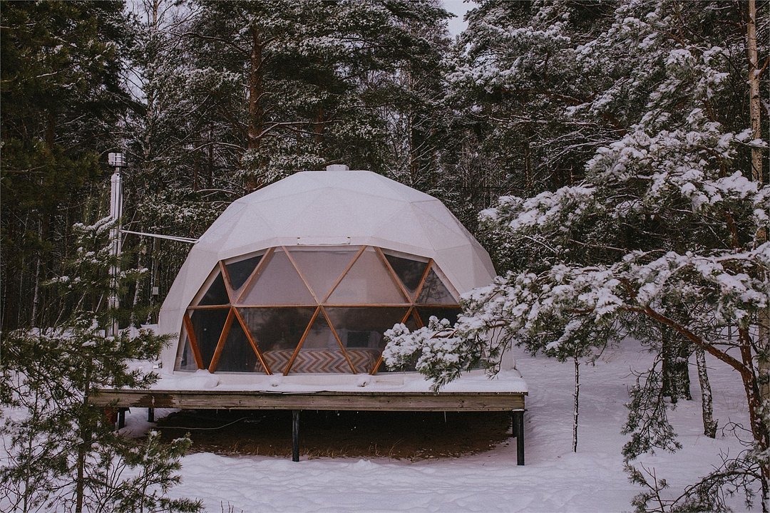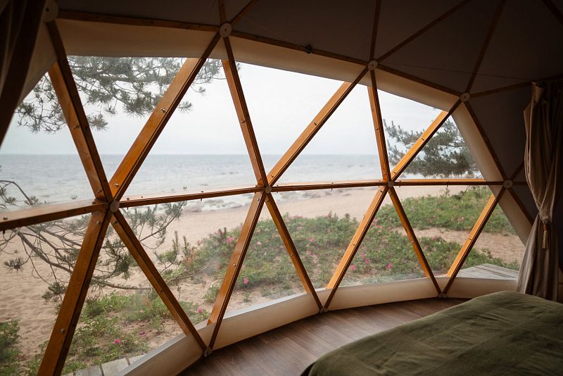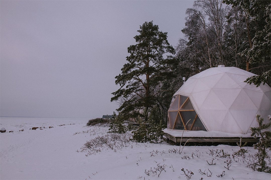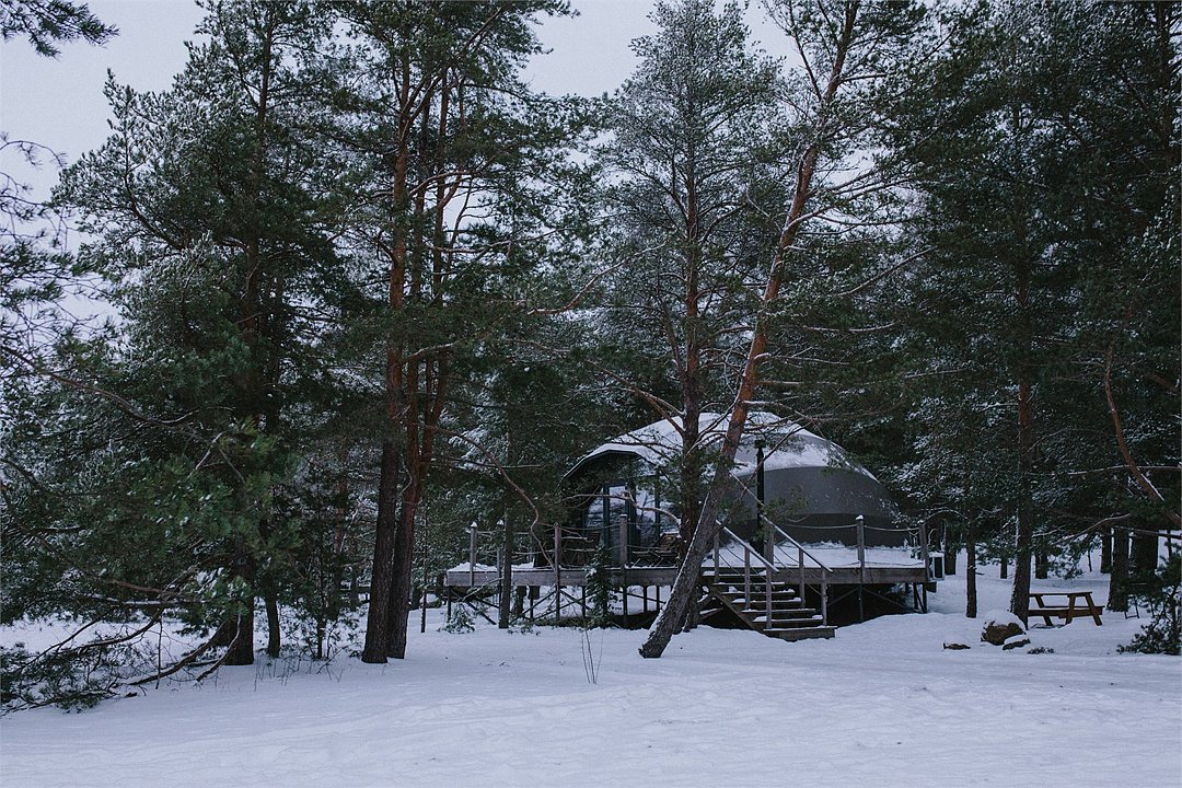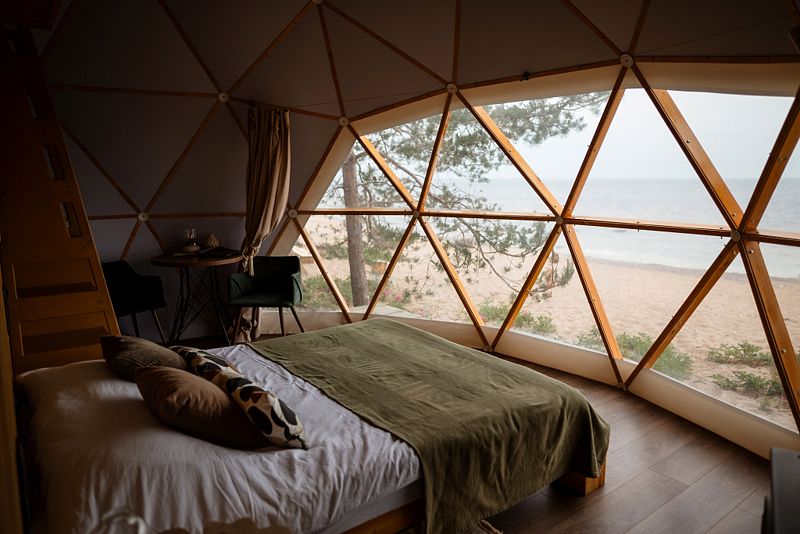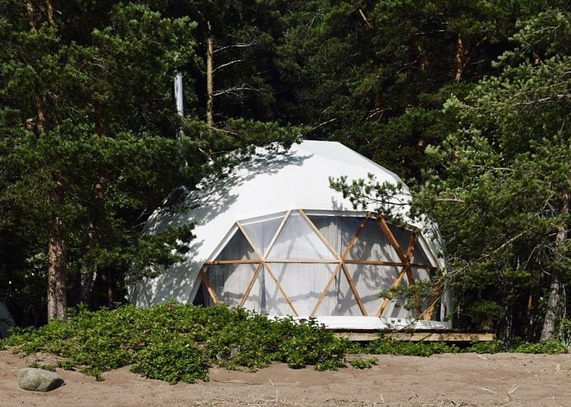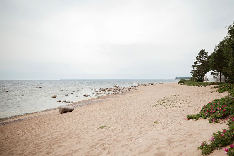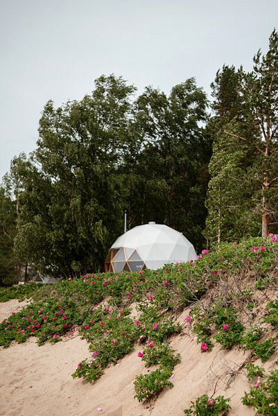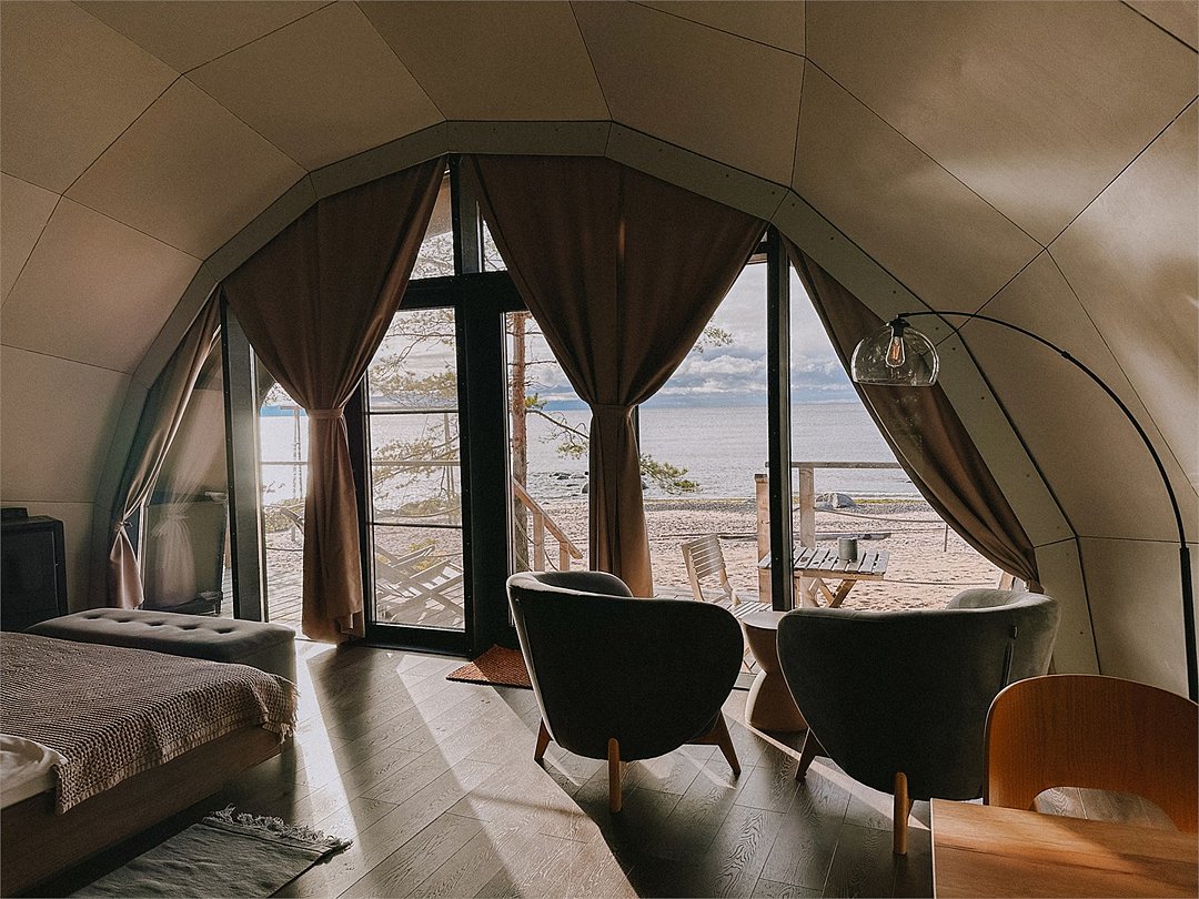 Купол с панорамным окном и видом на Финский залив или сосновый лес. Купола первой линии расположены на границе леса и пляжа, до воды около 50 метров. Купола второй линии чуть дальше от залива в лесу и вид из окна открывается на окружающую территорию. Внутри теплые полы и дровяная печь для комфортного отдыха даже в холодное время года.