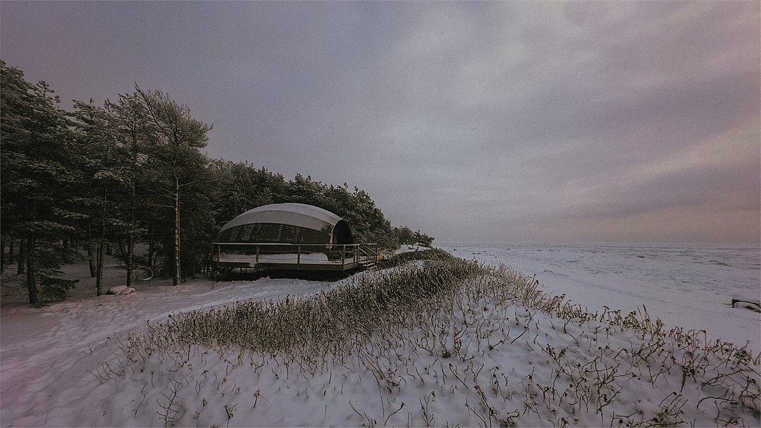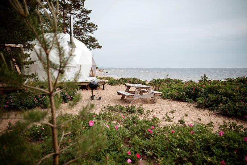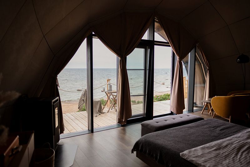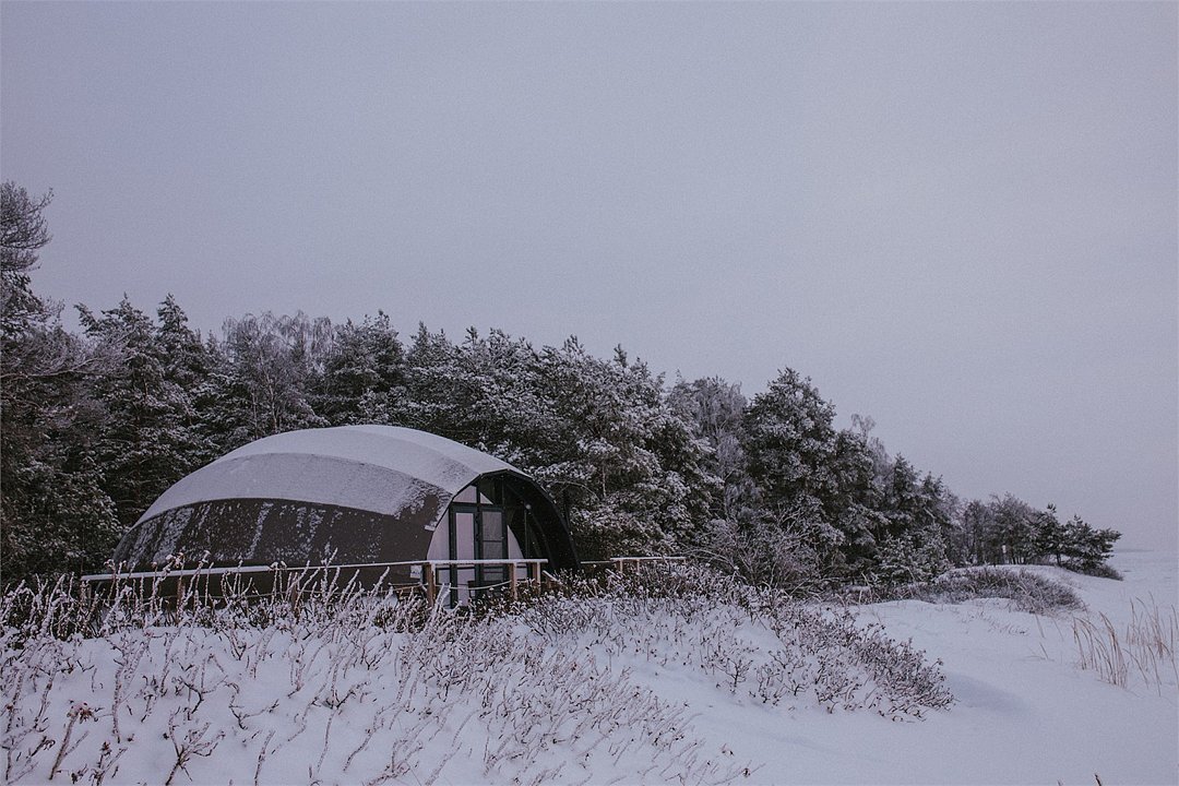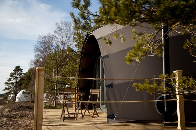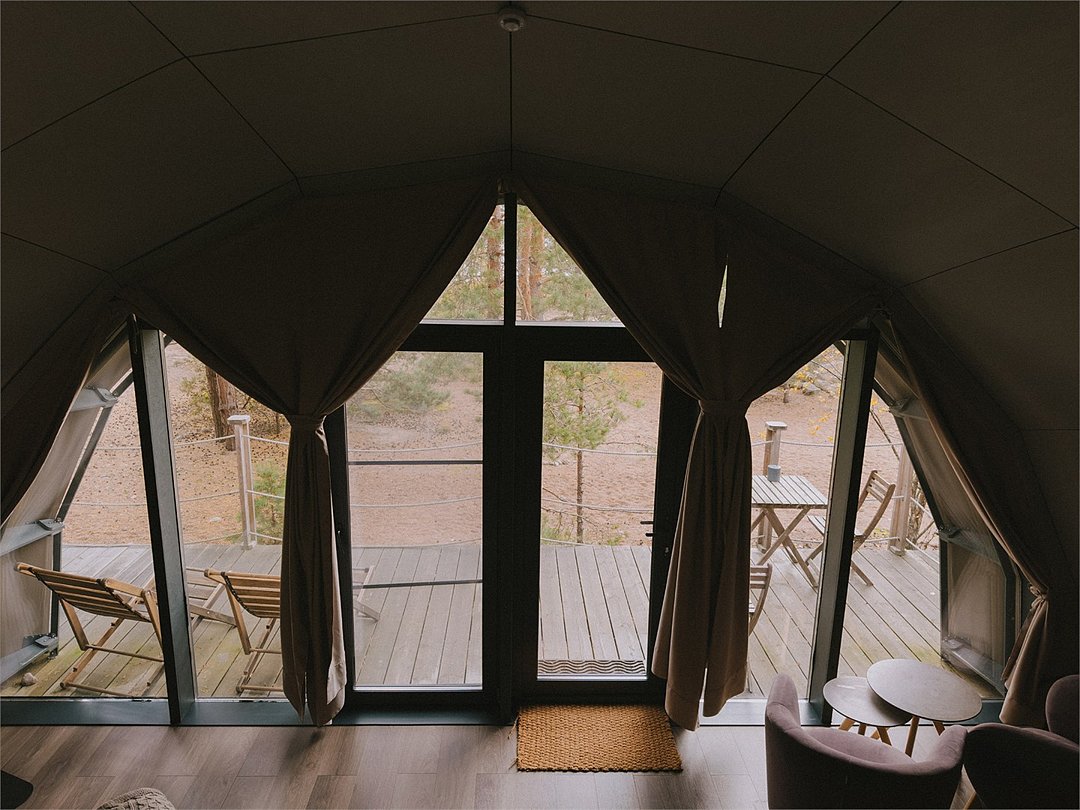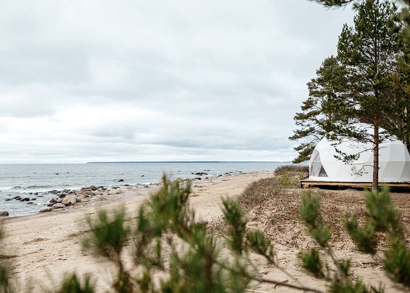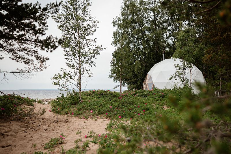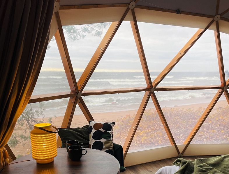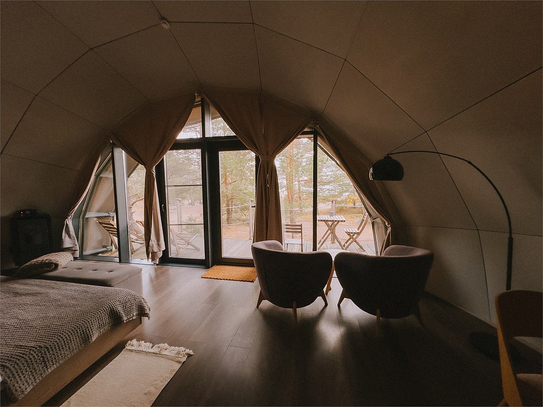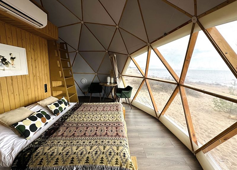 Купол с панорамным окном и видом на Финский залив или сосновый лес. Купола первой линии расположены на границе леса и пляжа, до воды около 50 метров. Купола второй линии чуть дальше от залива в лесу и вид из окна открывается на окружающую территорию. Внутри теплые полы и дровяная печь для комфортного отдыха даже в холодное время года.
