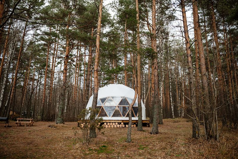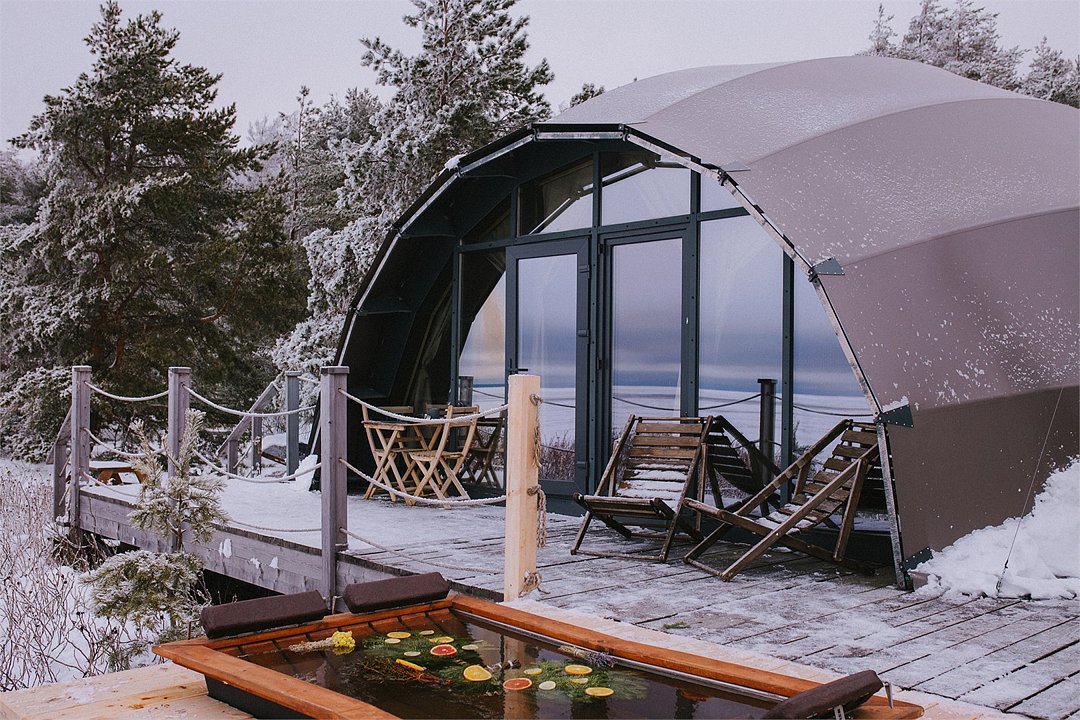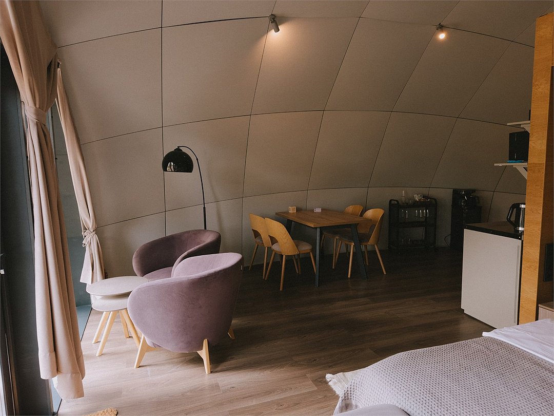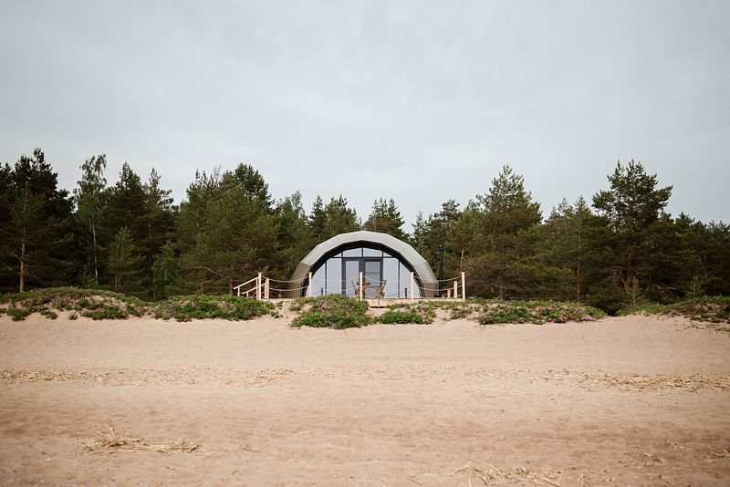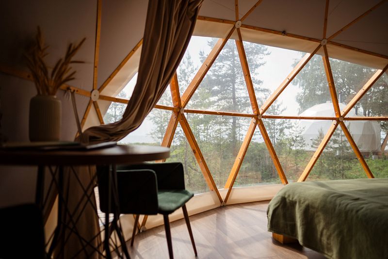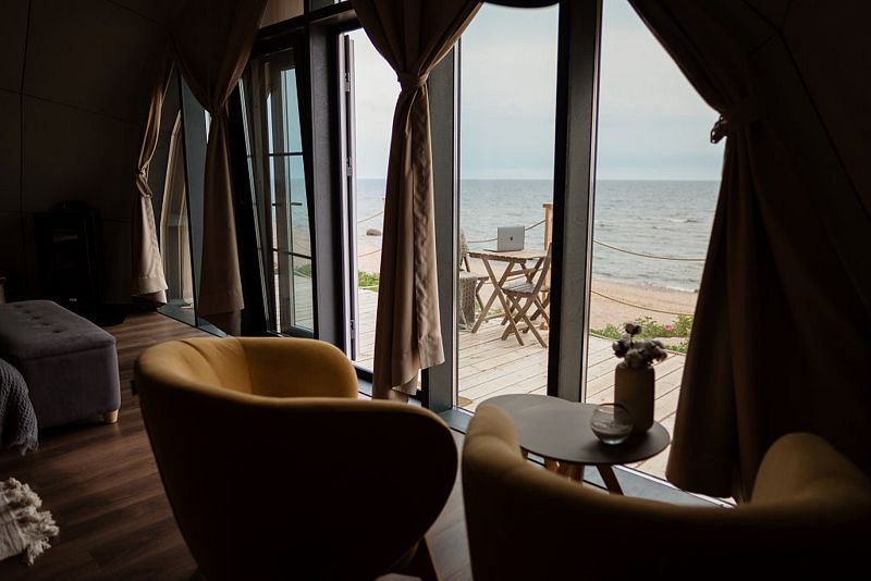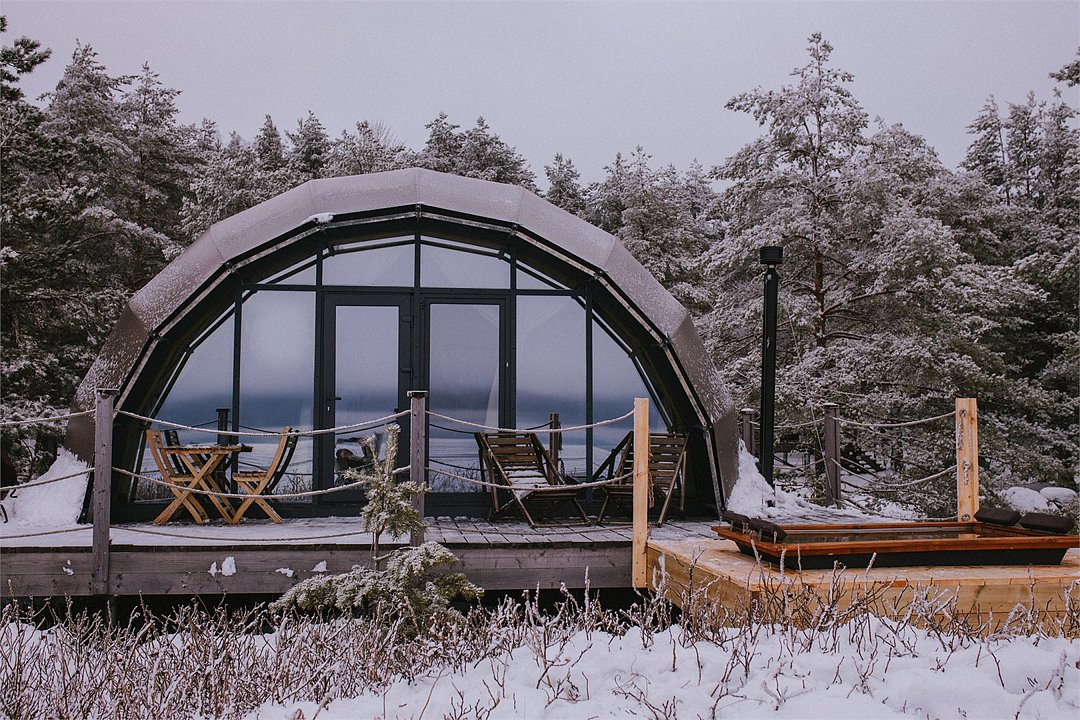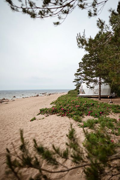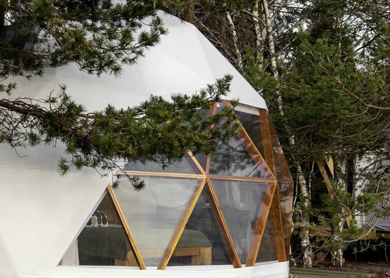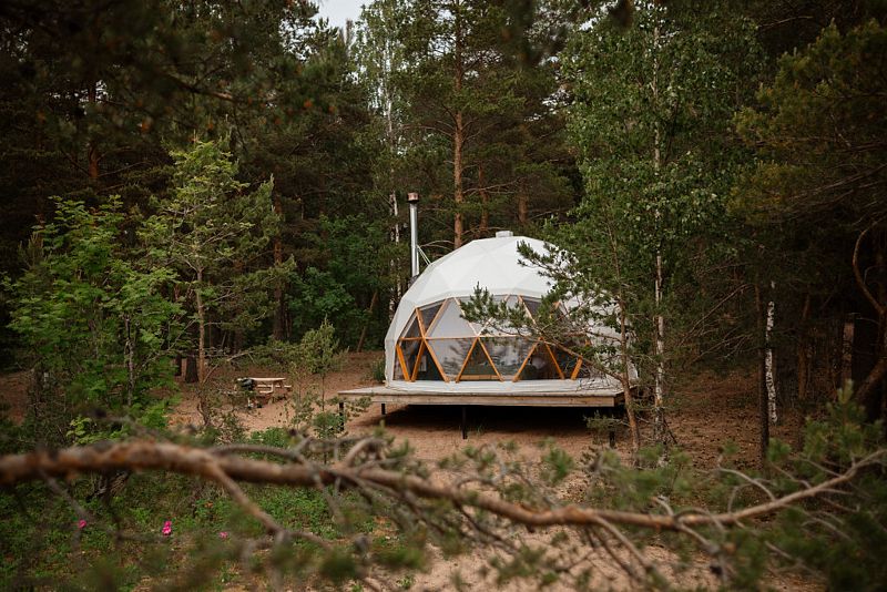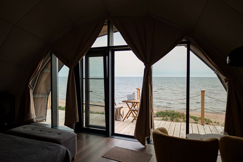 Купол с панорамным окном и видом на Финский залив или сосновый лес. Купола первой линии расположены на границе леса и пляжа, до воды около 50 метров. Купола второй линии чуть дальше от залива в лесу и вид из окна открывается на окружающую территорию. Внутри теплые полы и дровяная печь для комфортного отдыха даже в холодное время года.