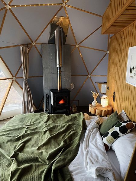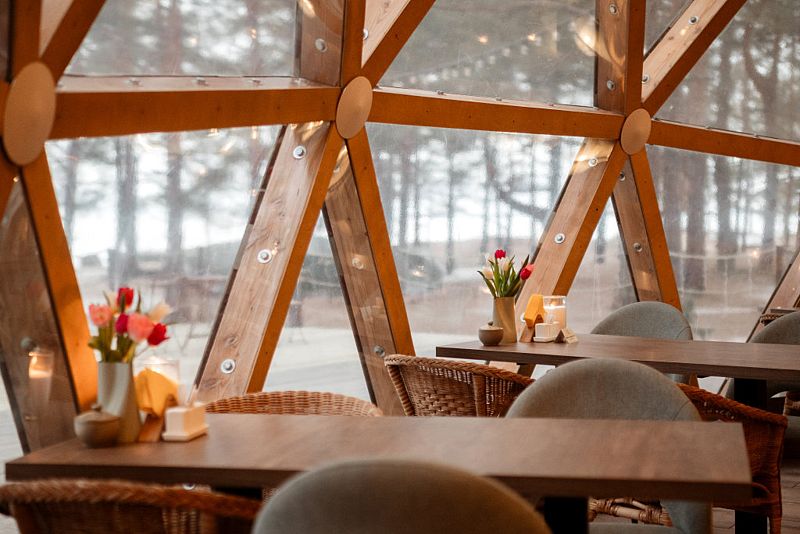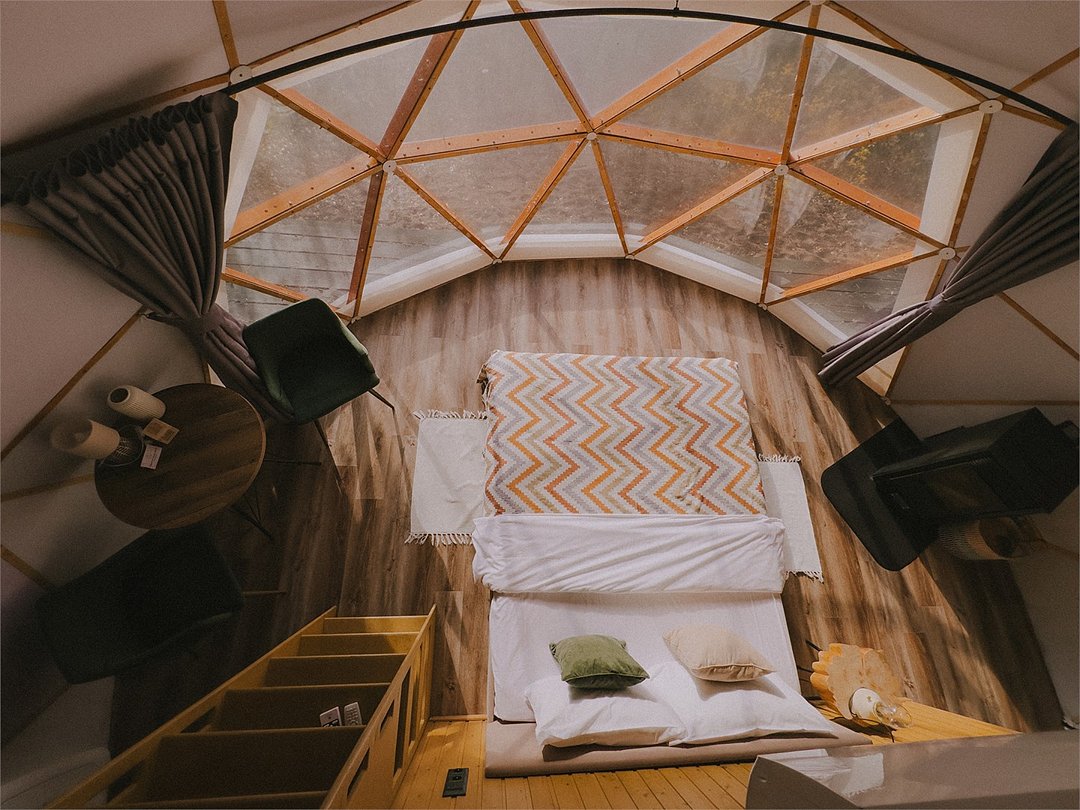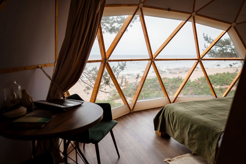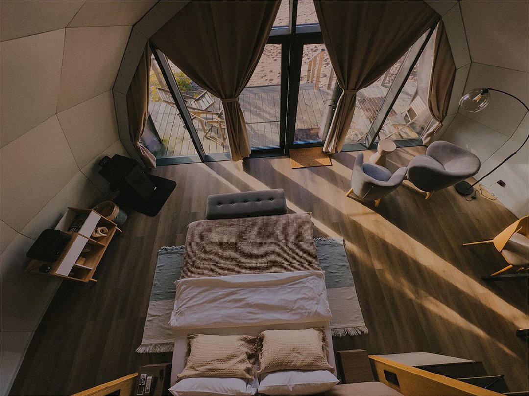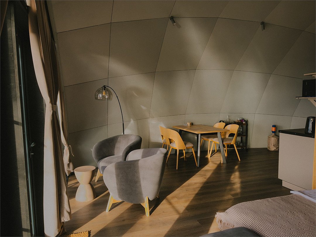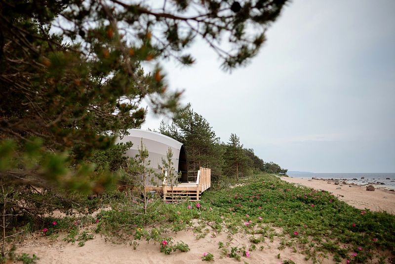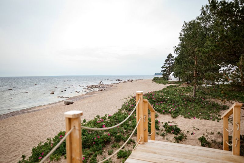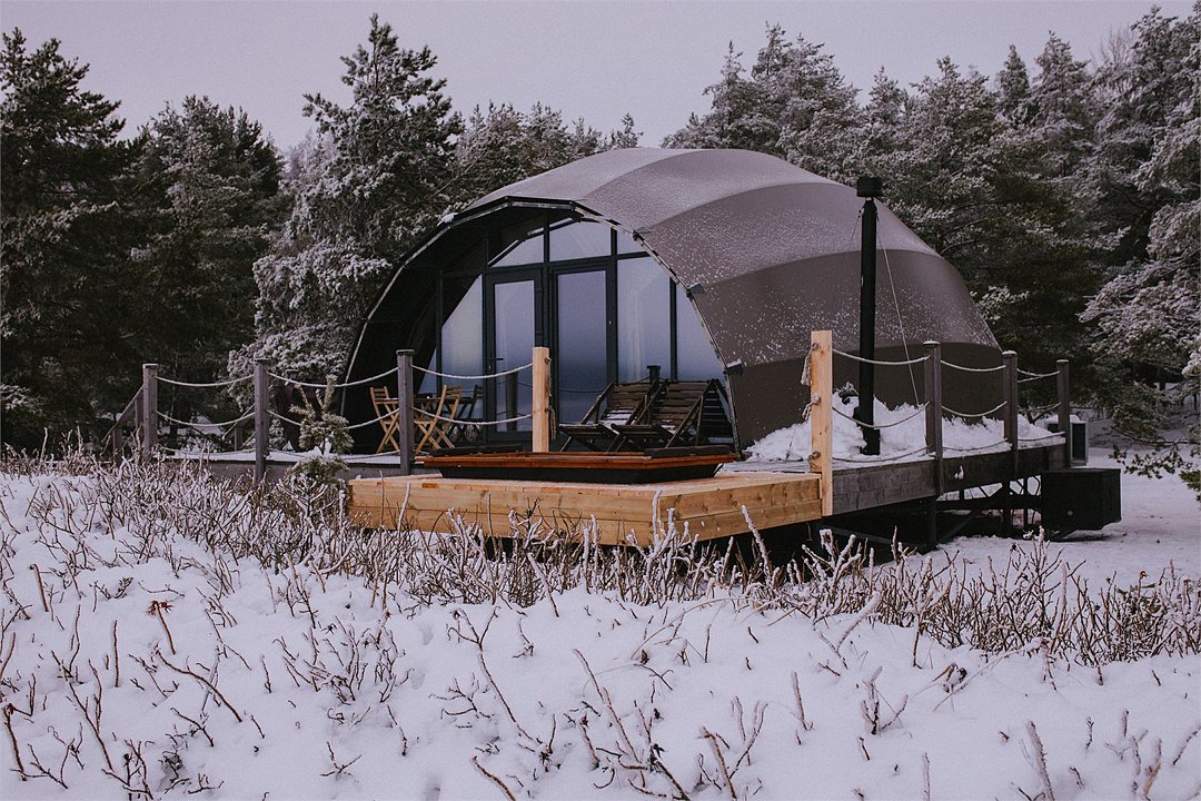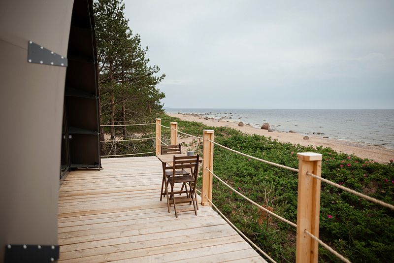Купол с панорамным окном и видом на Финский залив или сосновый лес. Купола первой линии расположены на границе леса и пляжа, до воды около 50 метров. Купола второй линии чуть дальше от залива в лесу и вид из окна открывается на окружающую территорию. Внутри теплые полы и дровяная печь для комфортного отдыха даже в холодное время года.