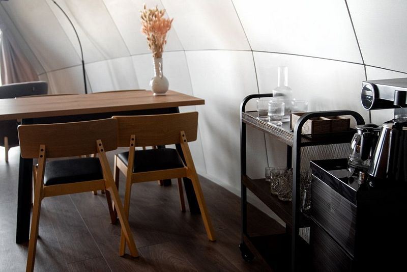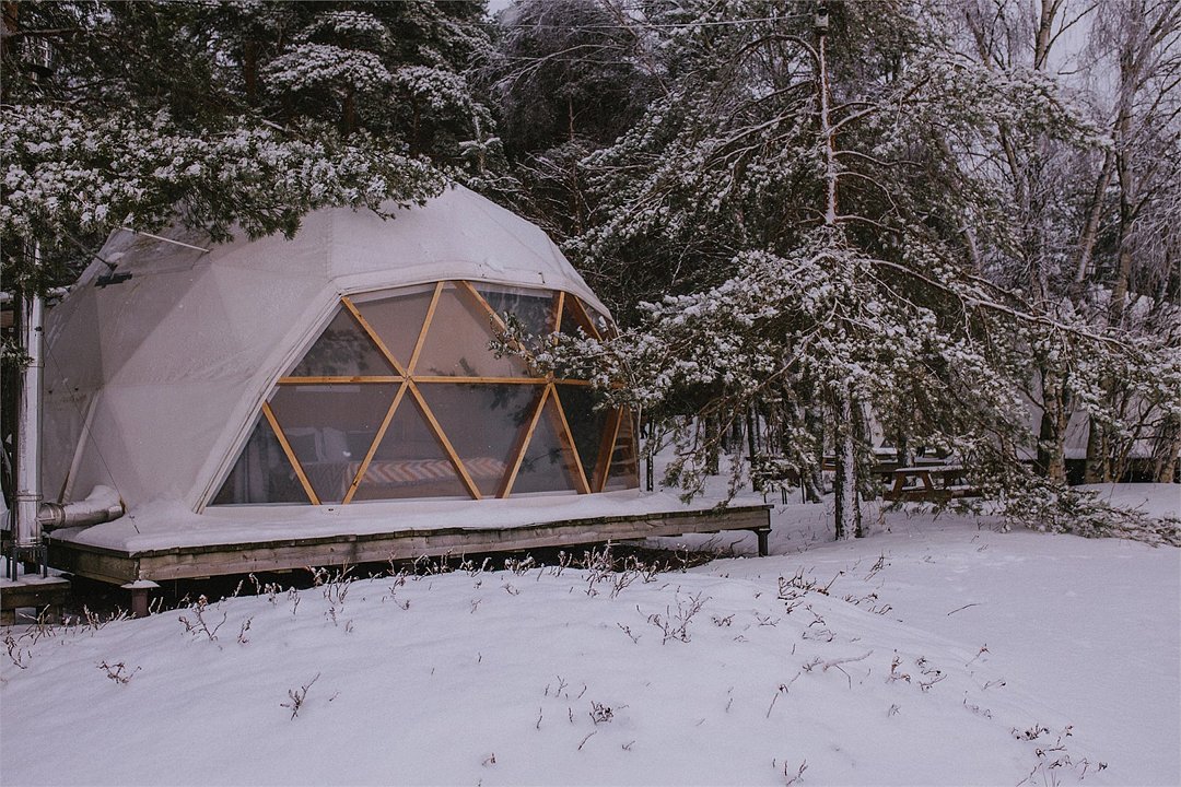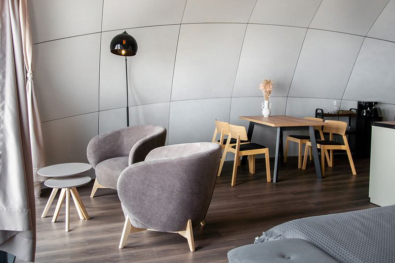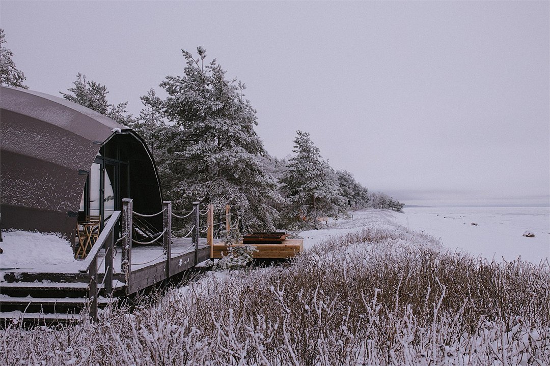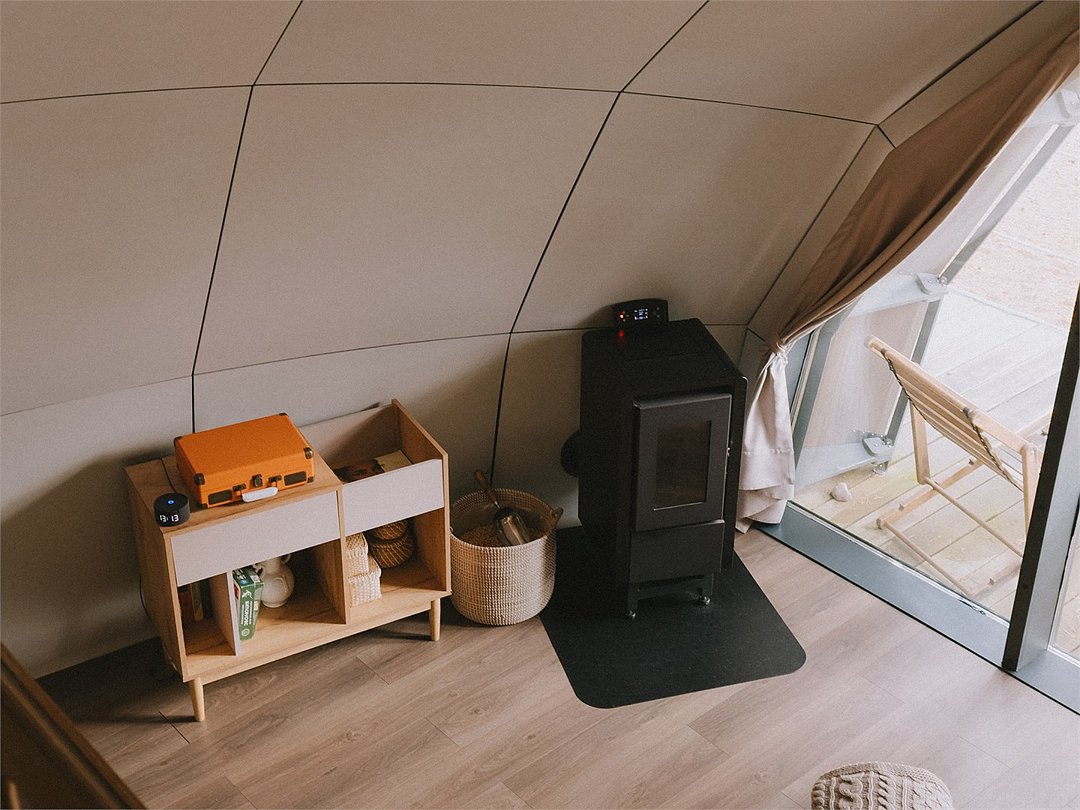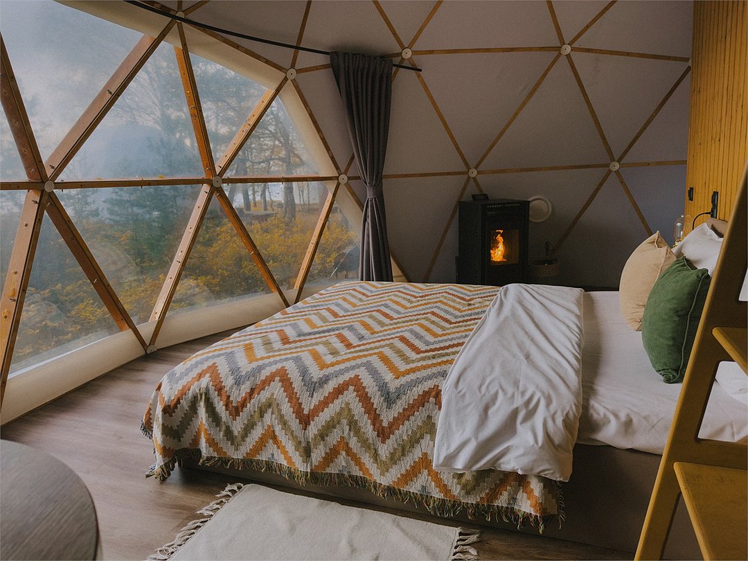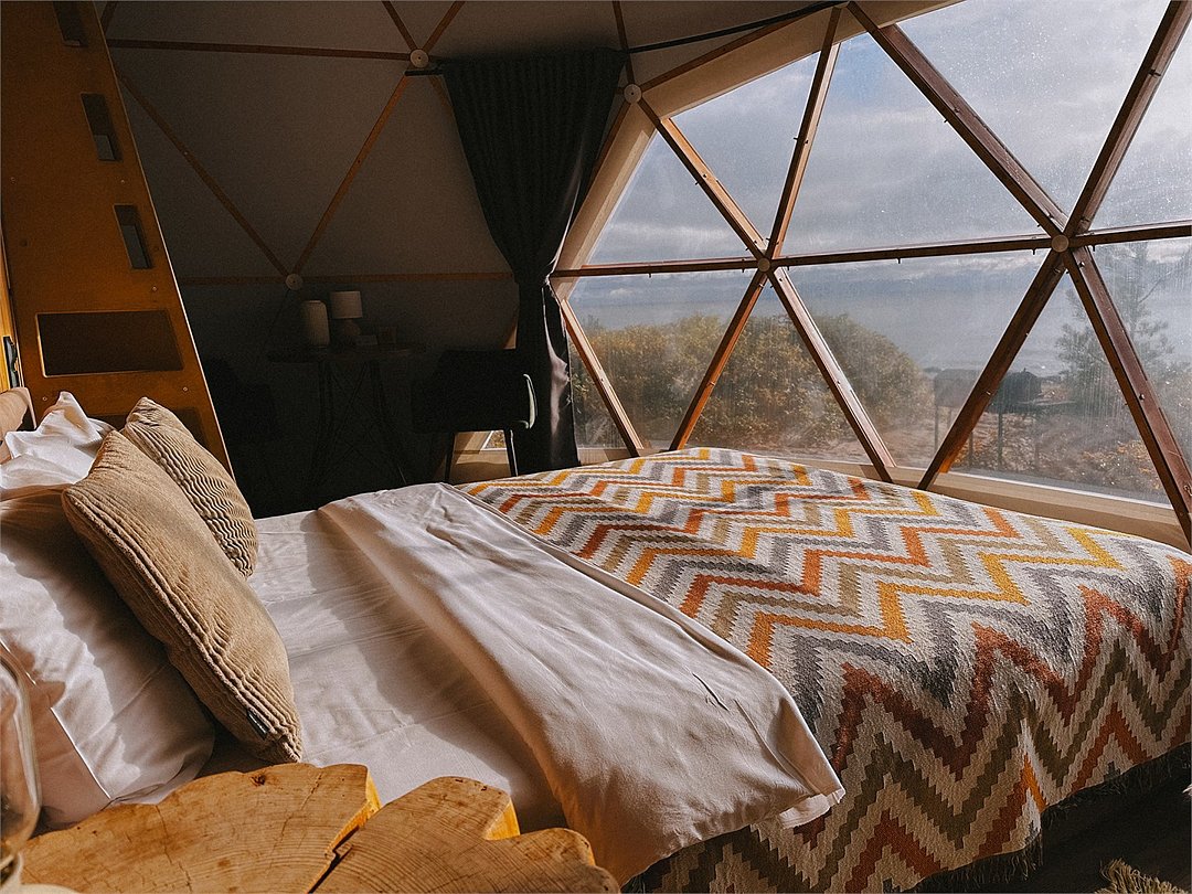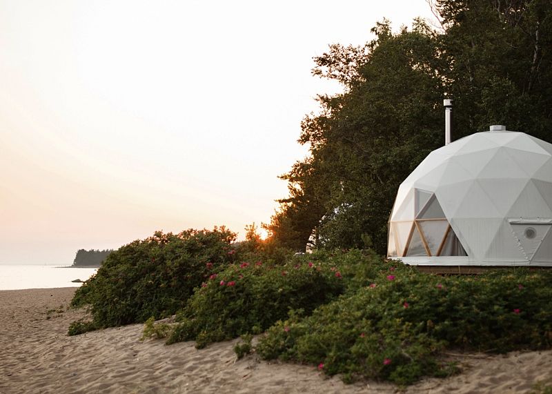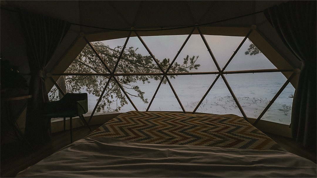 Купол с панорамным окном и видом на Финский залив или сосновый лес. Купола первой линии расположены на границе леса и пляжа, до воды около 50 метров. Купола второй линии чуть дальше от залива в лесу и вид из окна открывается на окружающую территорию. Внутри теплые полы и дровяная печь для комфортного отдыха даже в холодное время года.