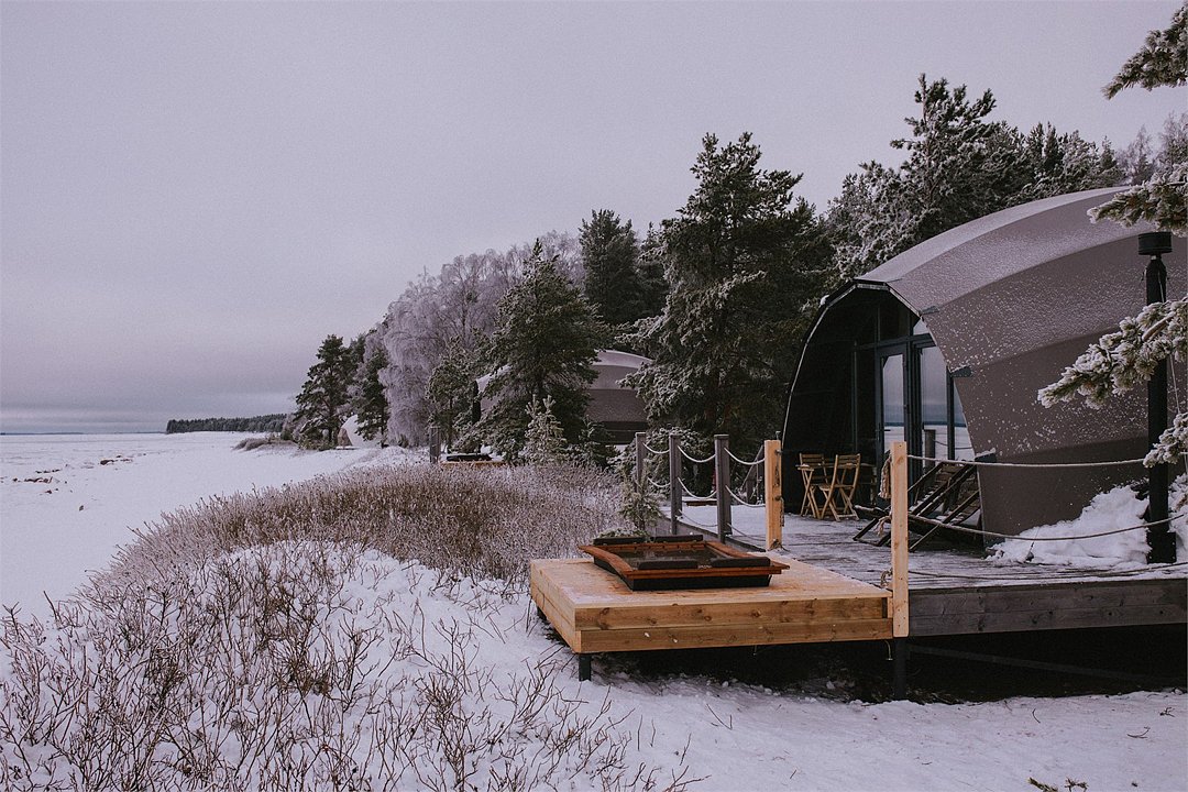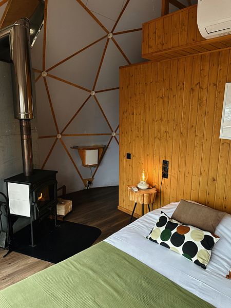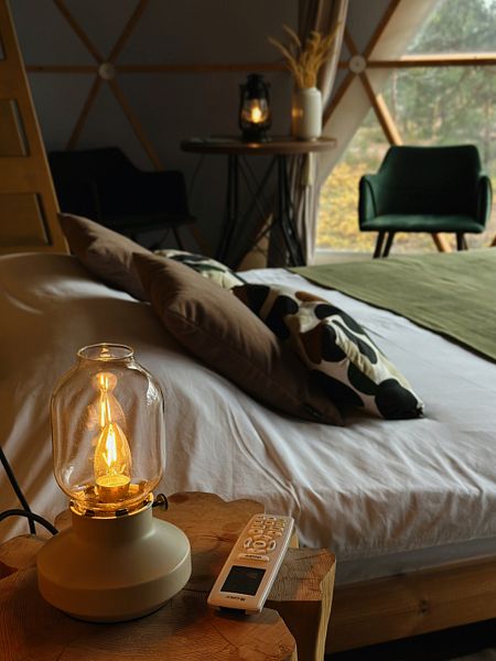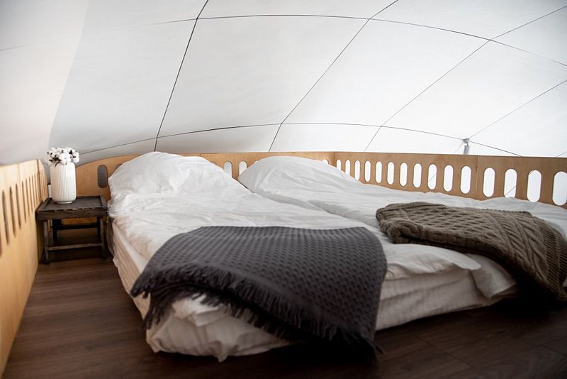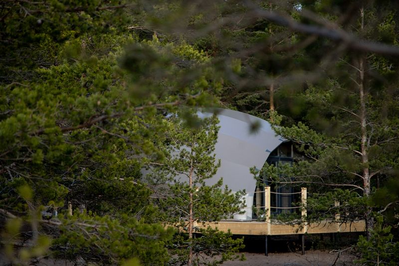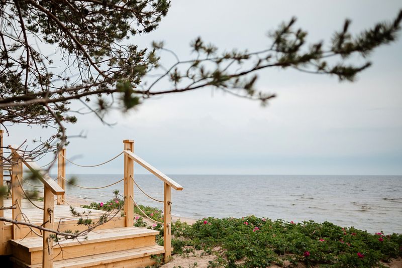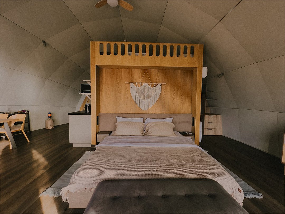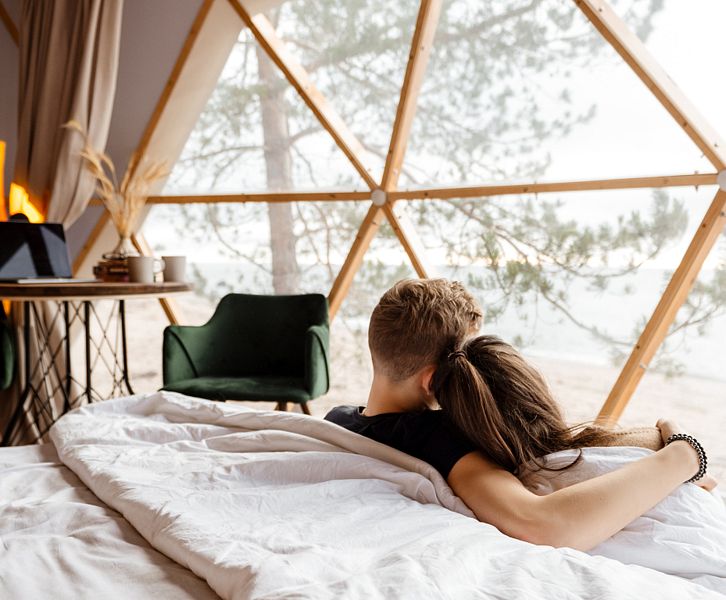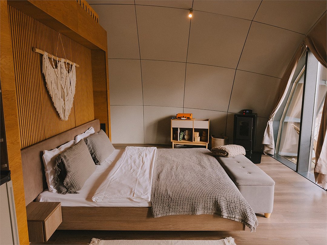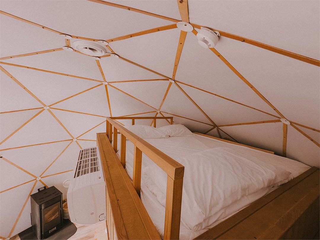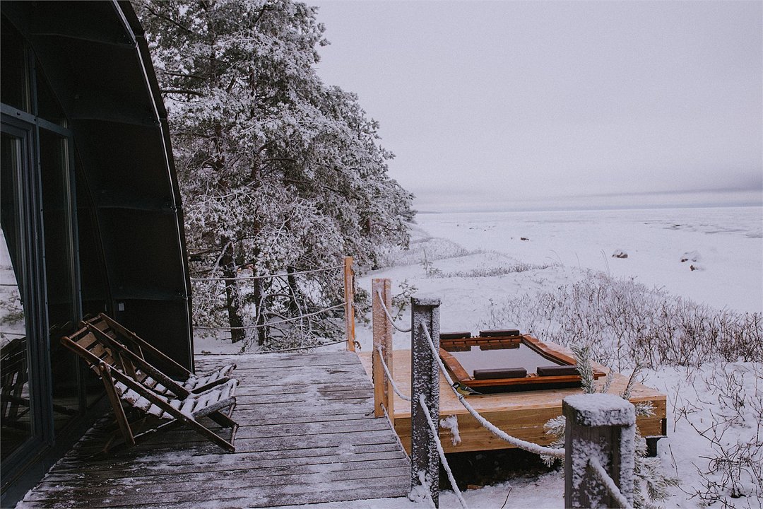 Купол с панорамным окном и видом на Финский залив или сосновый лес. Купола первой линии расположены на границе леса и пляжа, до воды около 50 метров. Купола второй линии чуть дальше от залива в лесу и вид из окна открывается на окружающую территорию. Внутри теплые полы и дровяная печь для комфортного отдыха даже в холодное время года.